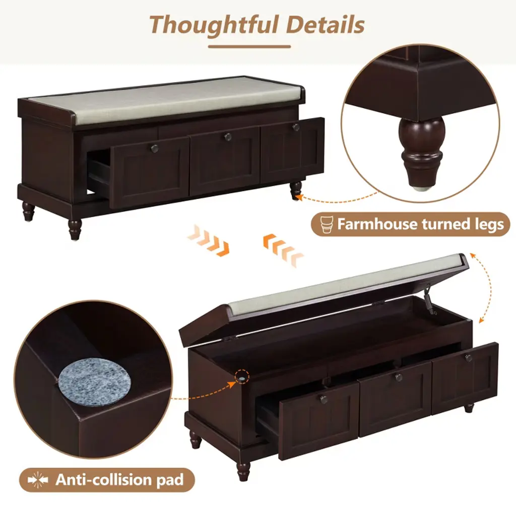 This classic shoe bench with a cushioned seat and three drawers is a perfect blend of style and functionality. Its grooved doors and round handles exude vintage charm, while the premium materials ensure long-lasting durability and a smooth texture. Available in four colors, it easily matches any interior style. The ample storage space, including drawers and a hidden compartment under the cushion, keeps your entryway, living room, or bedroom organized. Thoughtful details like the soft cushion and farmhouse-turned legs add comfort and timeless elegance.