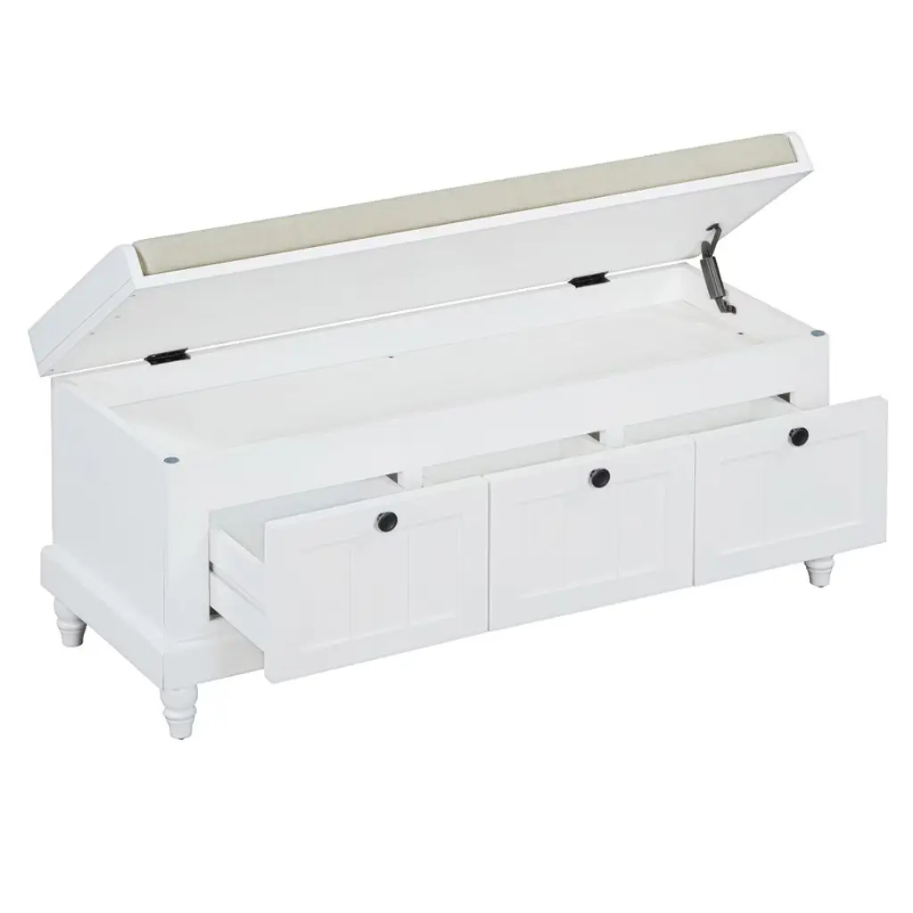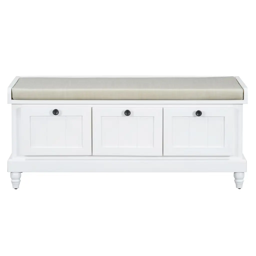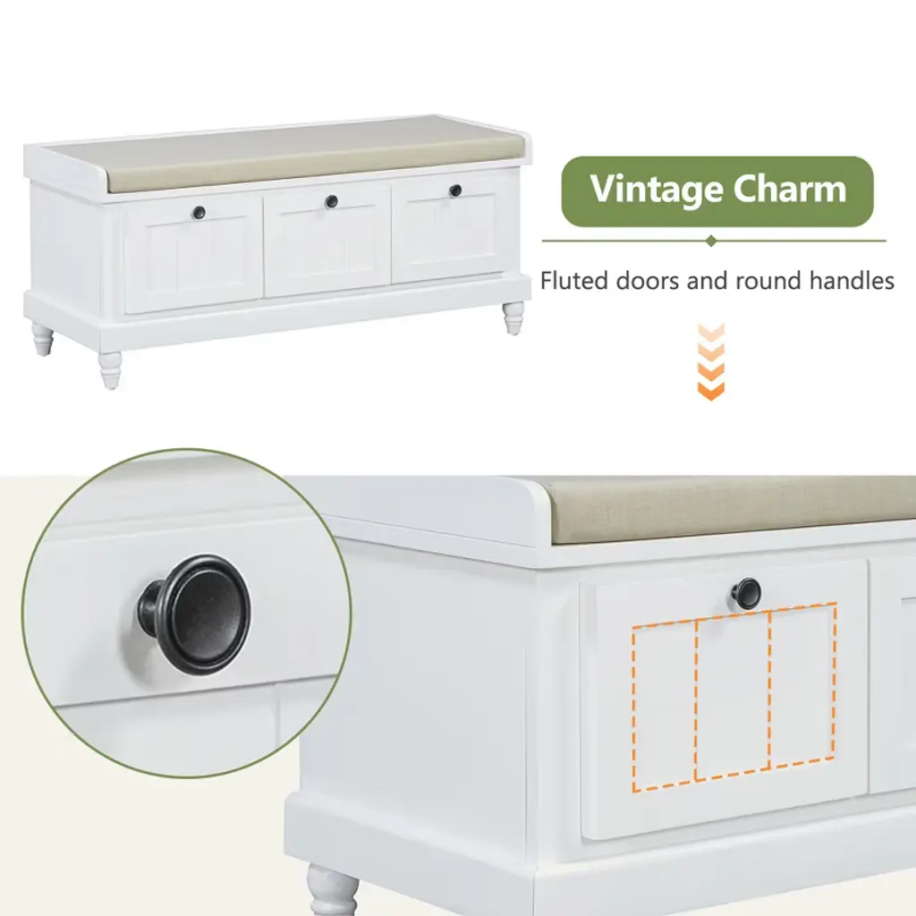 This classic shoe bench with a cushioned seat and three drawers is a perfect blend of style and functionality. Its grooved doors and round handles exude vintage charm, while the premium materials ensure long-lasting durability and a smooth texture. Available in four colors, it easily matches any interior style. The ample storage space, including drawers and a hidden compartment under the cushion, keeps your entryway, living room, or bedroom organized. Thoughtful details like the soft cushion and farmhouse-turned legs add comfort and timeless elegance.