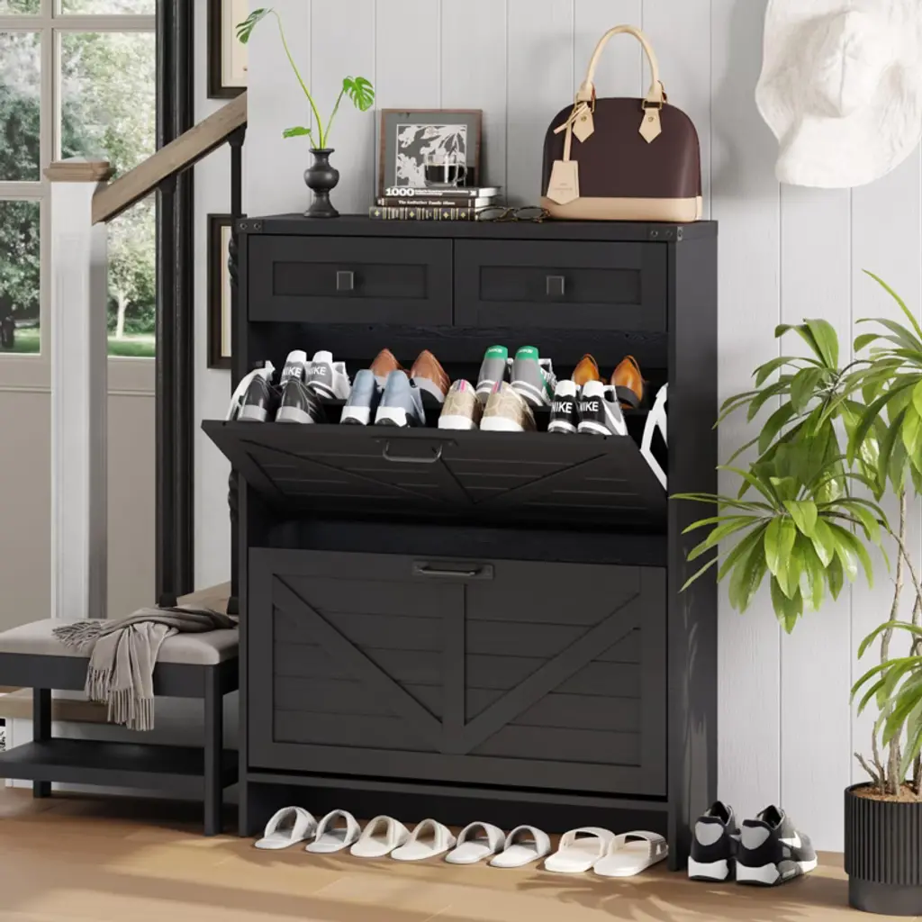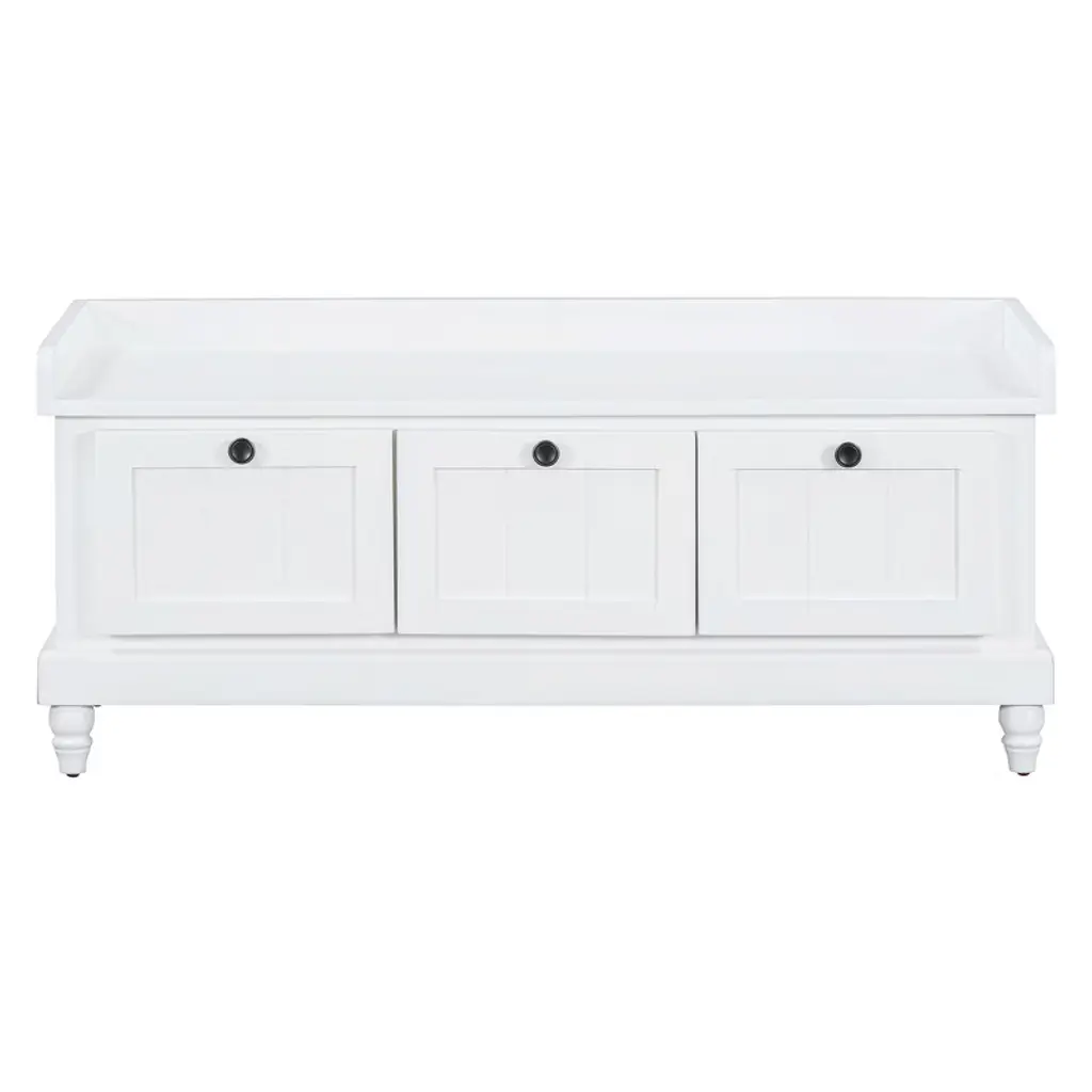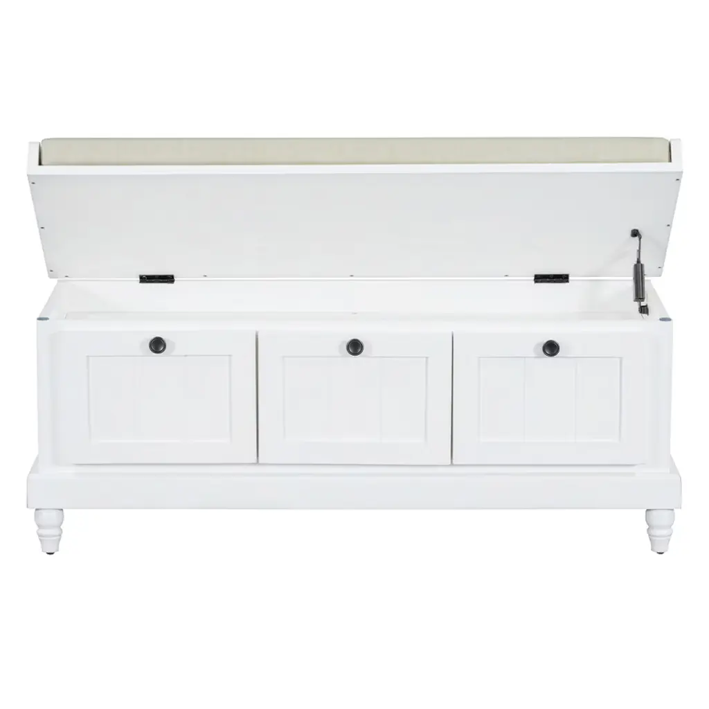 This classic shoe bench with a cushioned seat and three drawers is a perfect blend of style and functionality. Its grooved doors and round handles exude vintage charm, while the premium materials ensure long-lasting durability and a smooth texture. Available in four colors, it easily matches any interior style. The ample storage space, including drawers and a hidden compartment under the cushion, keeps your entryway, living room, or bedroom organized. Thoughtful details like the soft cushion and farmhouse-turned legs add comfort and timeless elegance.