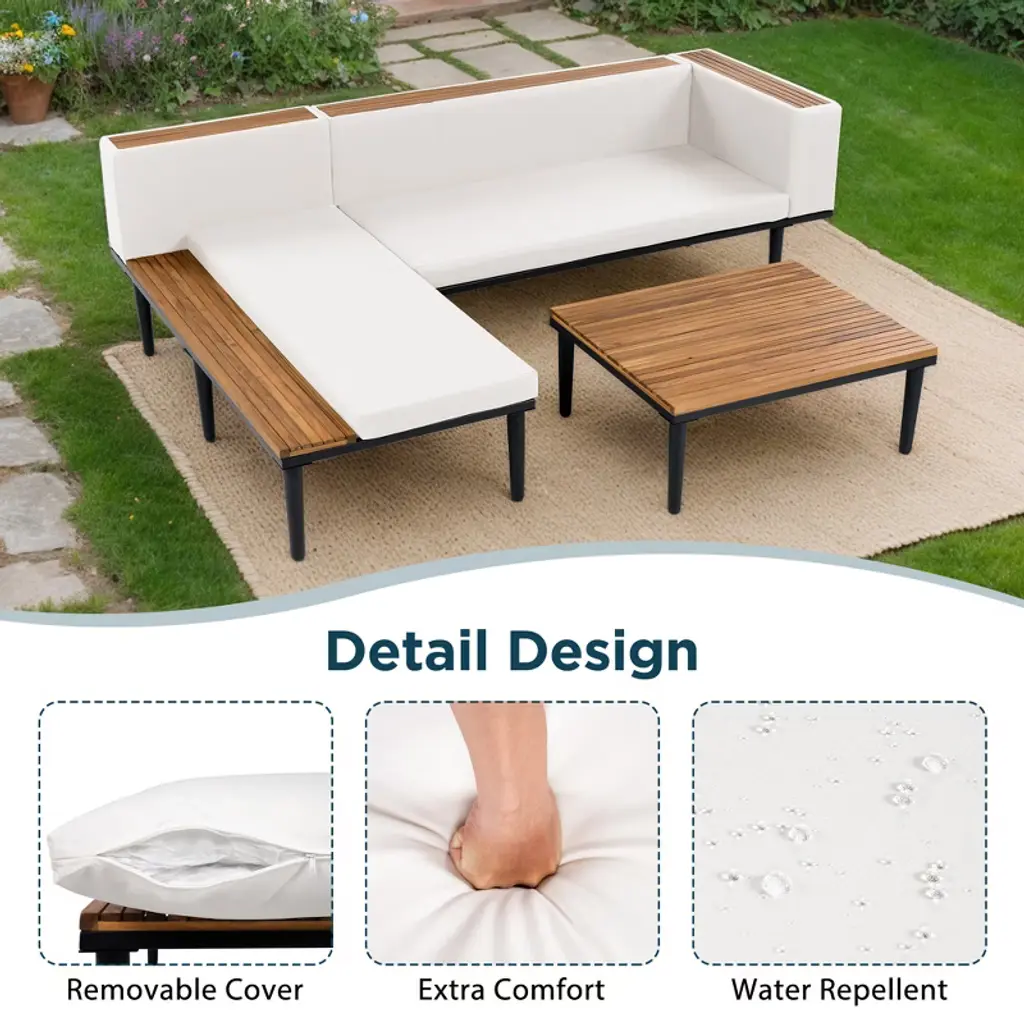 Elevate your outdoor living space with this contemporary sofa set designed for both style and functionality. The collection features a modern aesthetic with clean lines, complemented by a practical coffee table and built-in side table crafted from solid acacia wood. Designed for comfort, the set includes 3.15" thick seat cushions and three supportive backrest pillows, all upholstered in durable, water-resistant fabric that resists fading from sun exposure. The sturdy construction combines natural acacia wood with a reinforced iron frame, featuring adjustable non-slip feet that provide stability on various surfaces. Thoughtful details like the integrated side table offer convenient space for drinks and personal items.