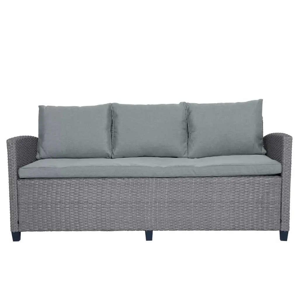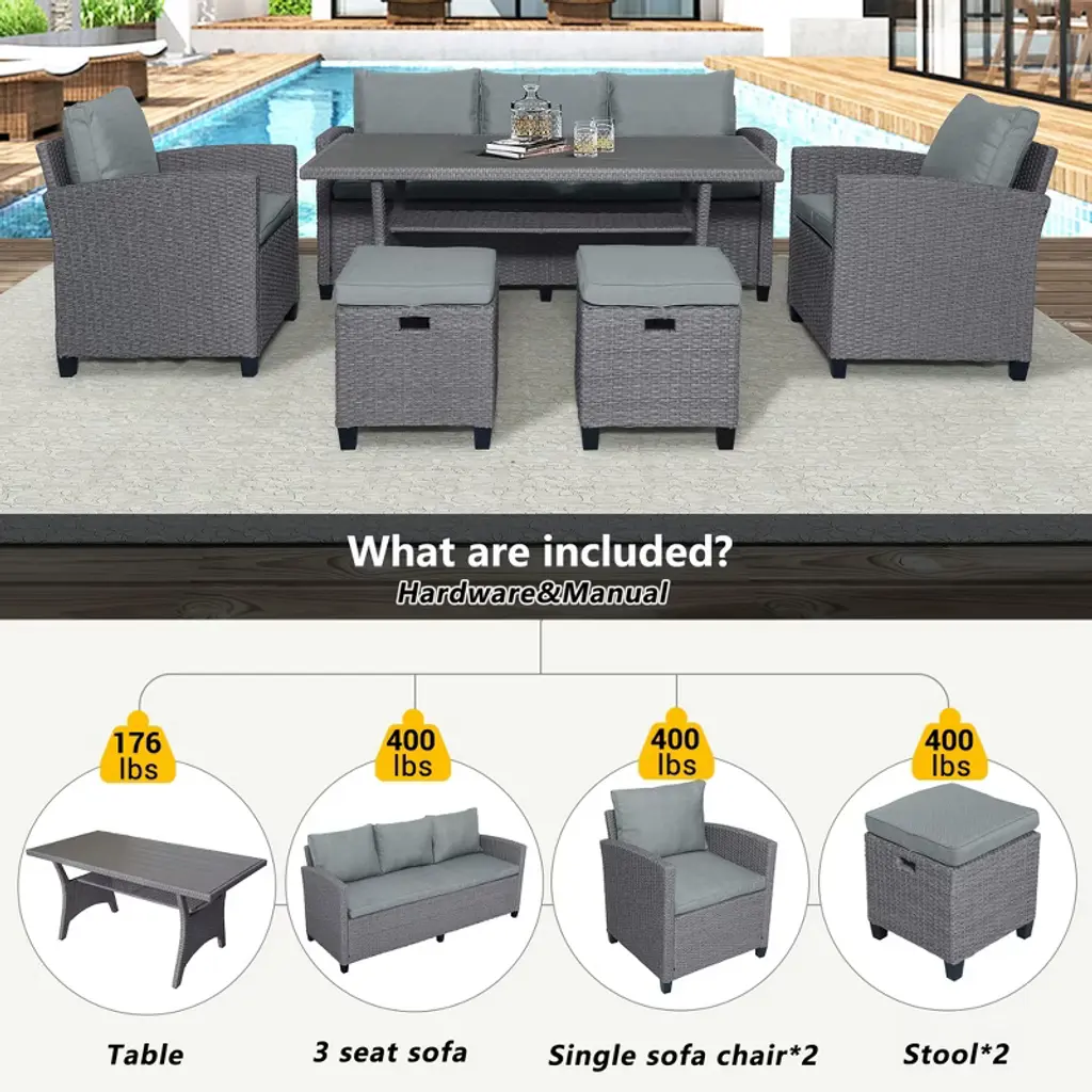 Transform your outdoor space into a comfortable and stylish retreat with this 6-piece patio furniture set.Featuring a spacious table, two sofa chairs, one 3-seater sofa, and two stools, it can seat up to 7 people comfortably.The set is perfect for enjoying food, drinks, and quality time with family and friends. With its high-quality materials and elegant design, this patio set is built to last and enhance your backyard or pool area.