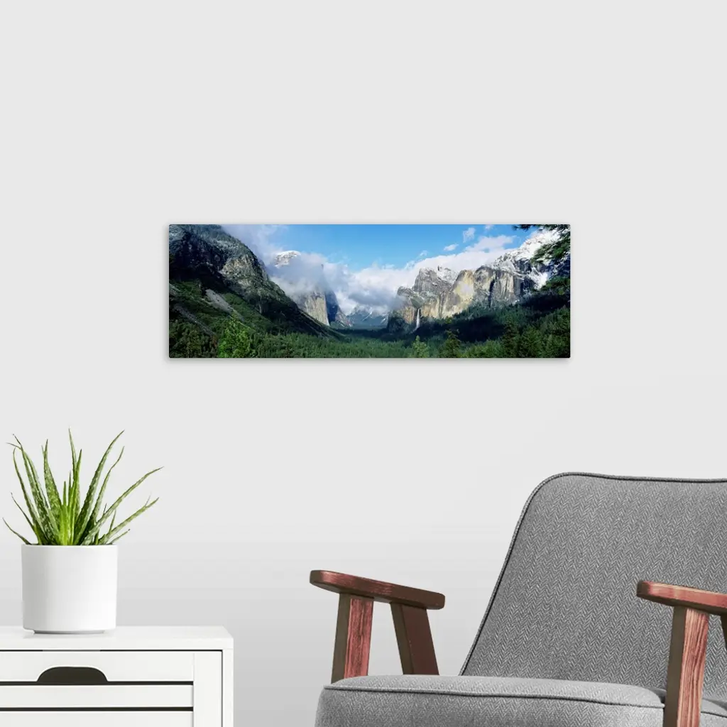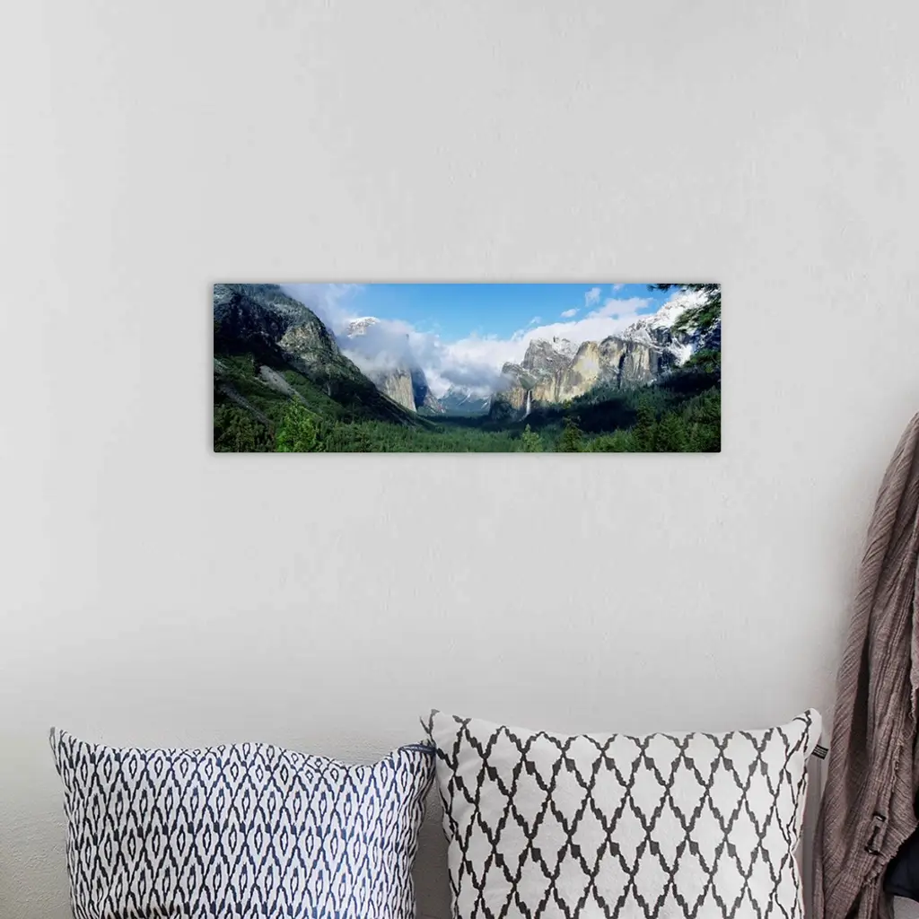 Panoramic photograph shows a valley in Yosemite National Park filled with a dense forest of trees that is surrounded by snow covered mountains with low-lying clouds rolling over them.