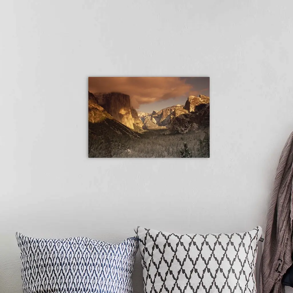 Yosemite Valley at dusk during winter, Yosemite National Park, California, USA wall art for home and office decor. Discover canvas art prints, photos, mural, big canvas art and framed wall art in GreatBigCanvas.com's varied collections.