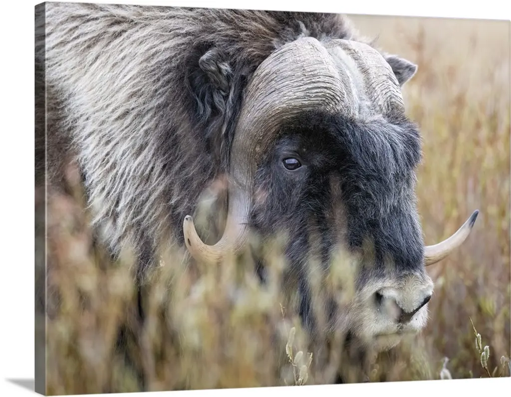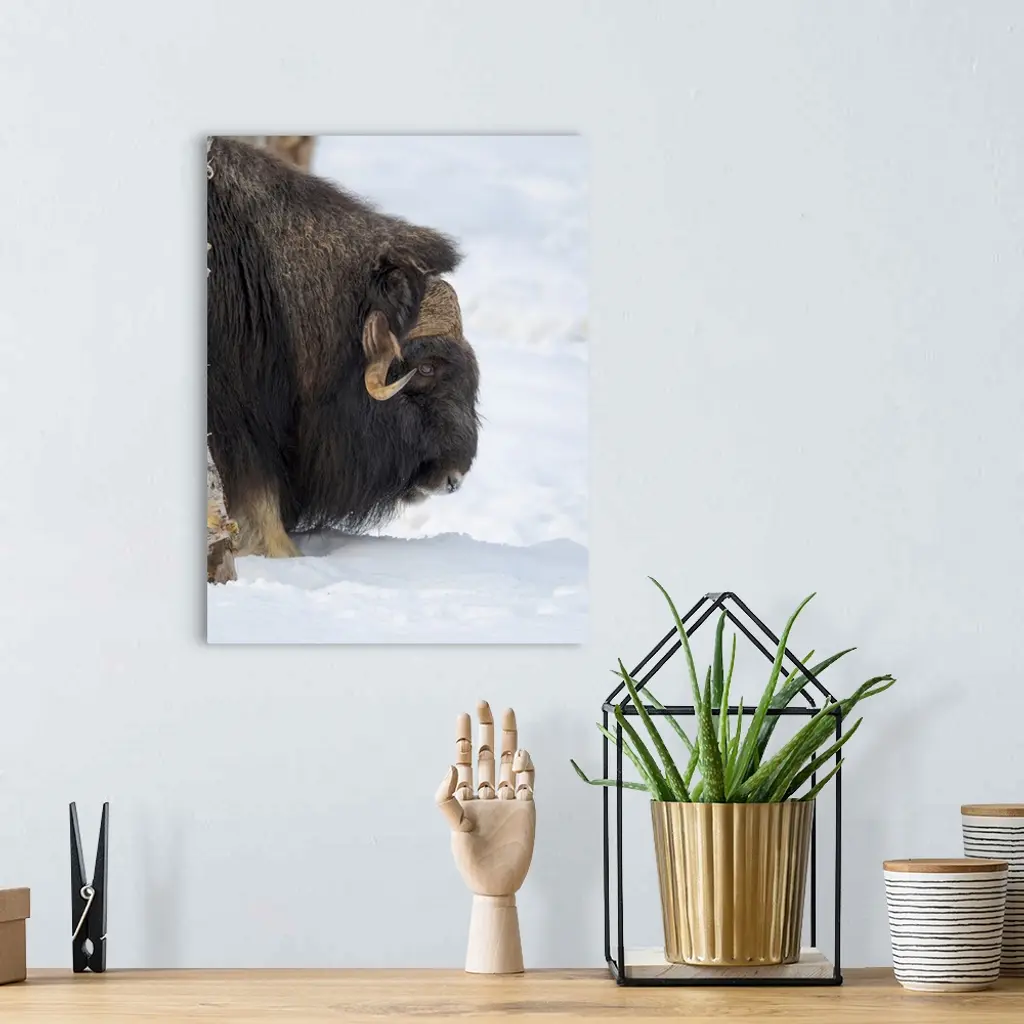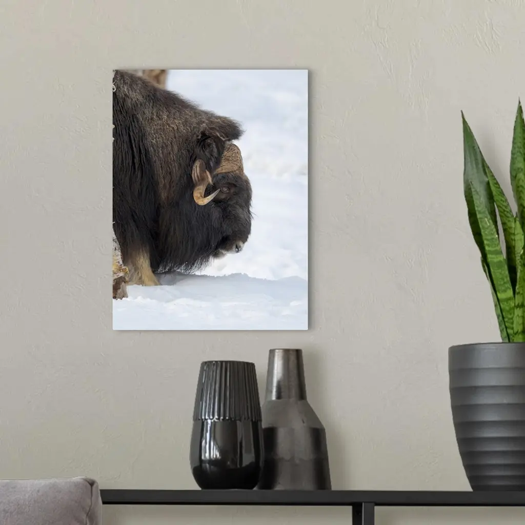 Young bull muskox in deep snow during winter. Scandinavia, Norway, Bardu, Polar Park.