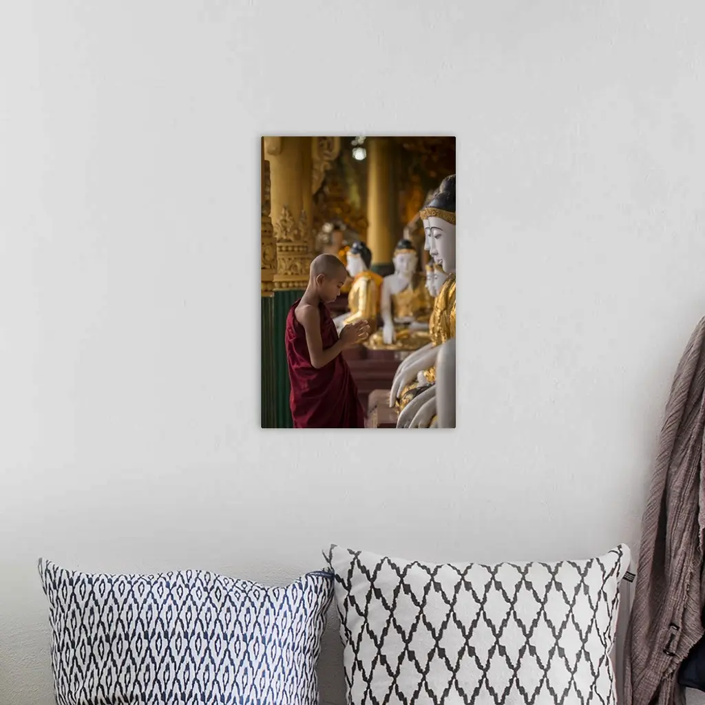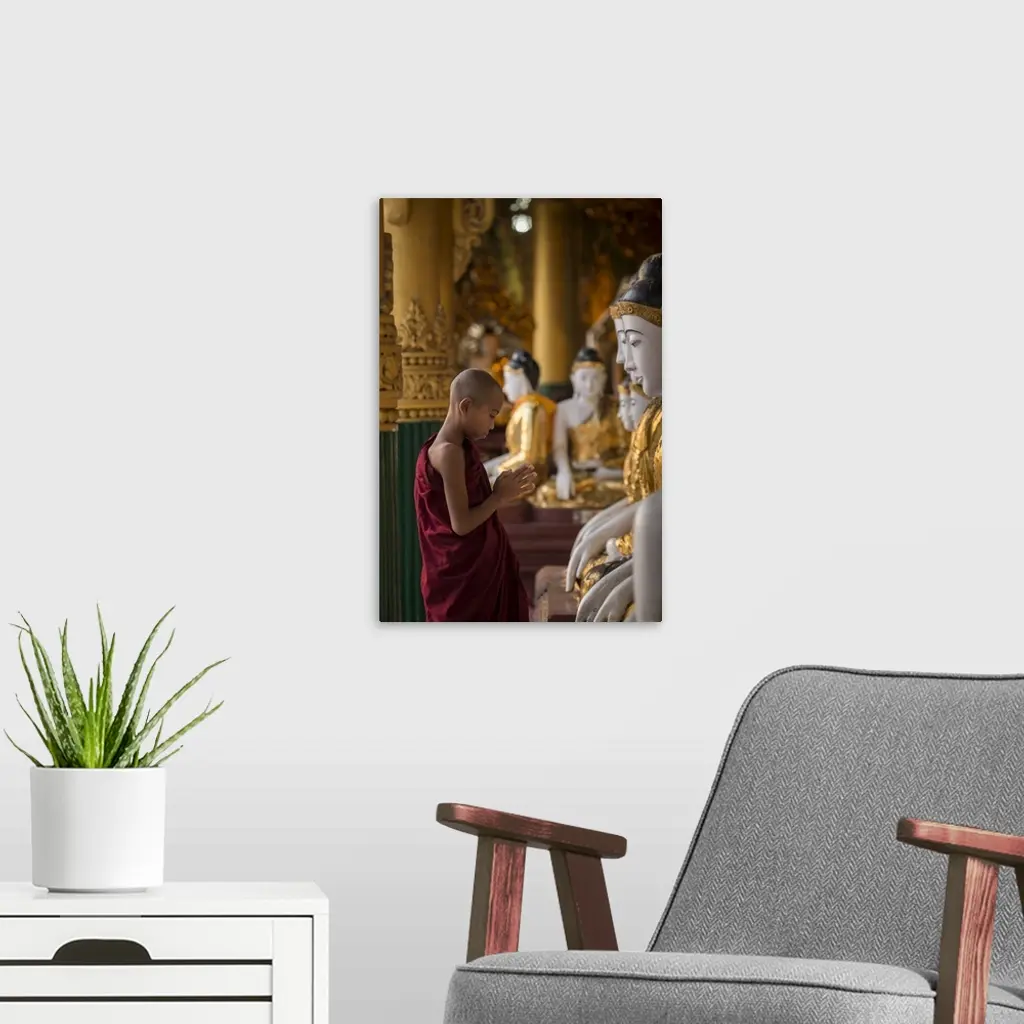Young Burmese monk praying with buddhas in Shwedagon Pagoda