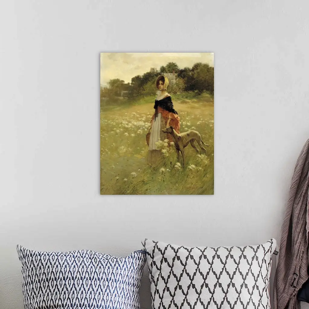 This scene of a young girl and her dog in a windswept field is a romantic image of American colonial life.