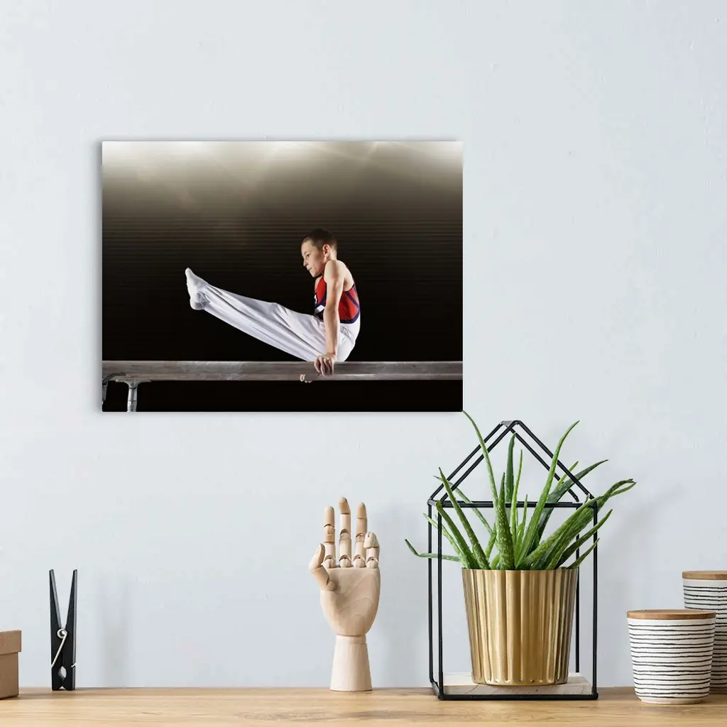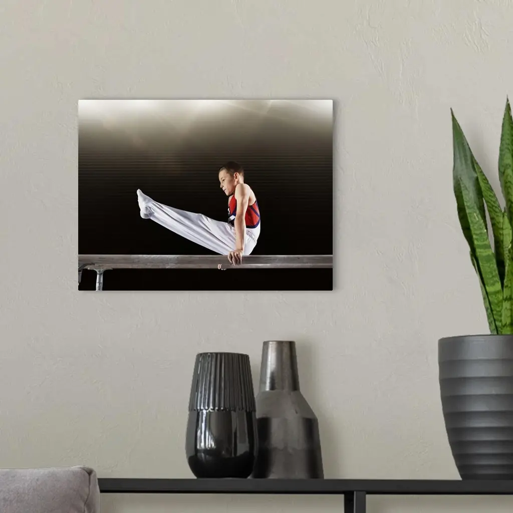 Young male gymnast performing on parallel bars wall art for home and office decor. Discover canvas art prints, photos, mural, big canvas art and framed wall art in GreatBigCanvas.com's varied collections.