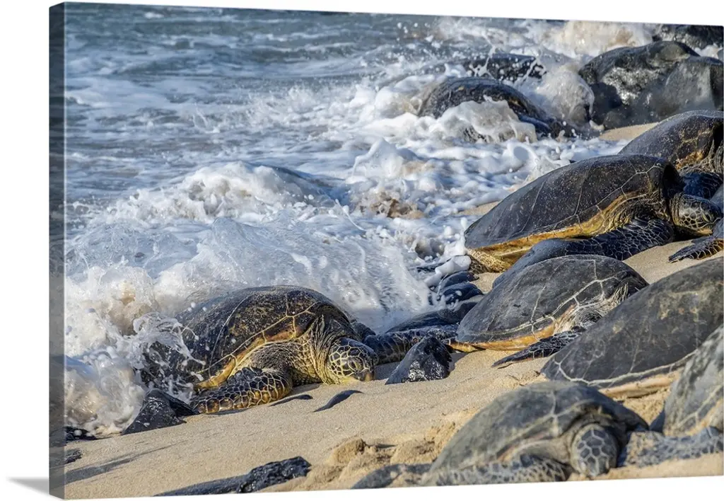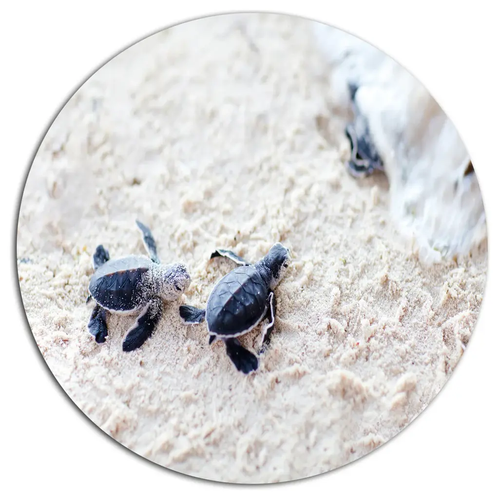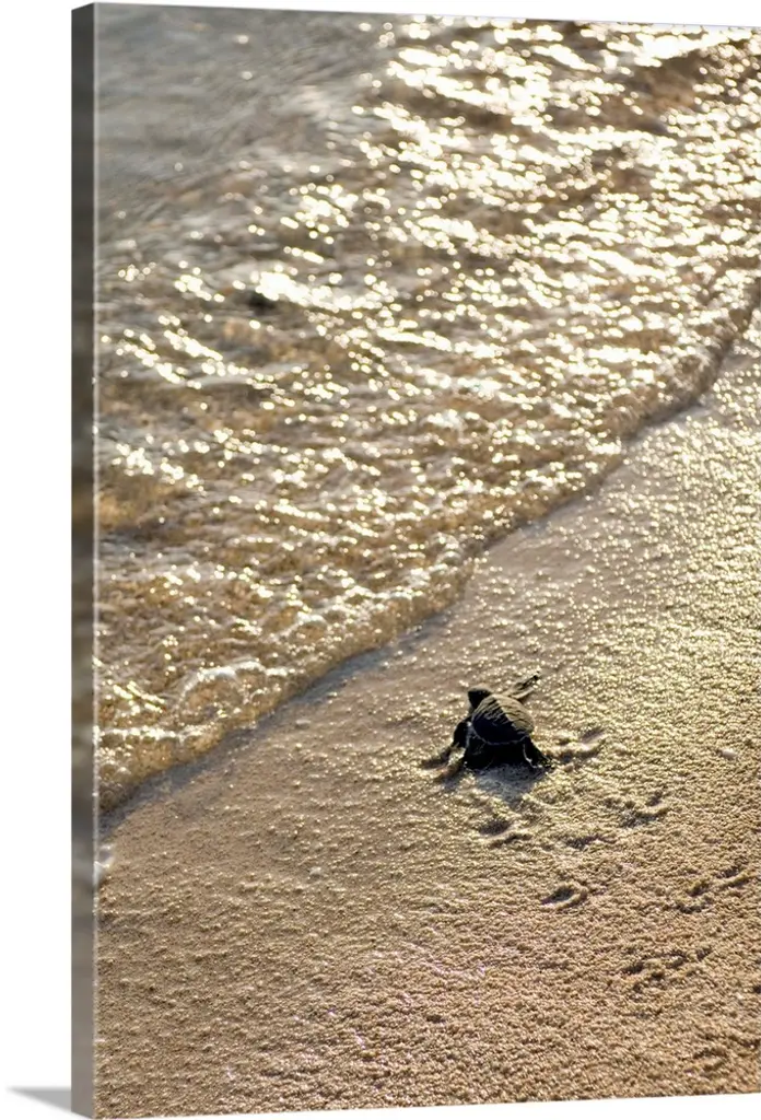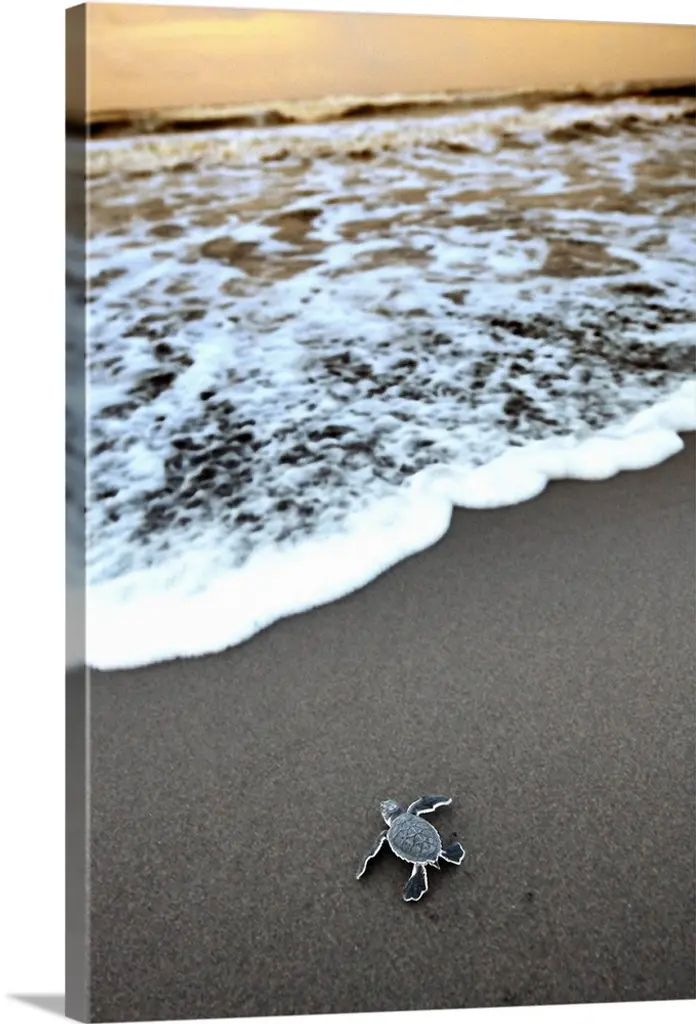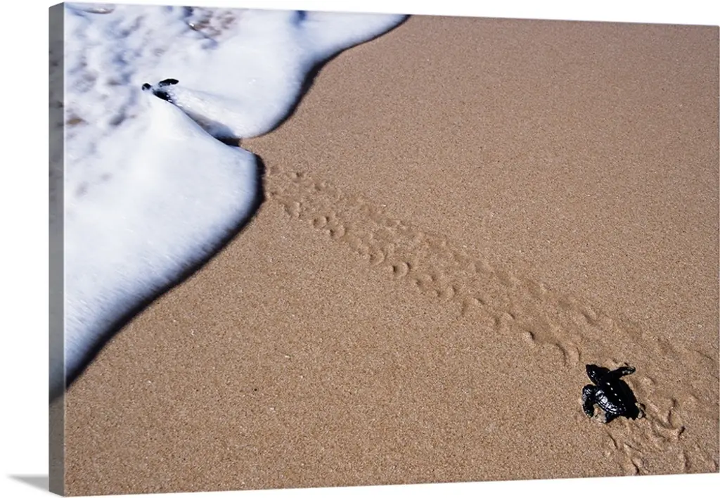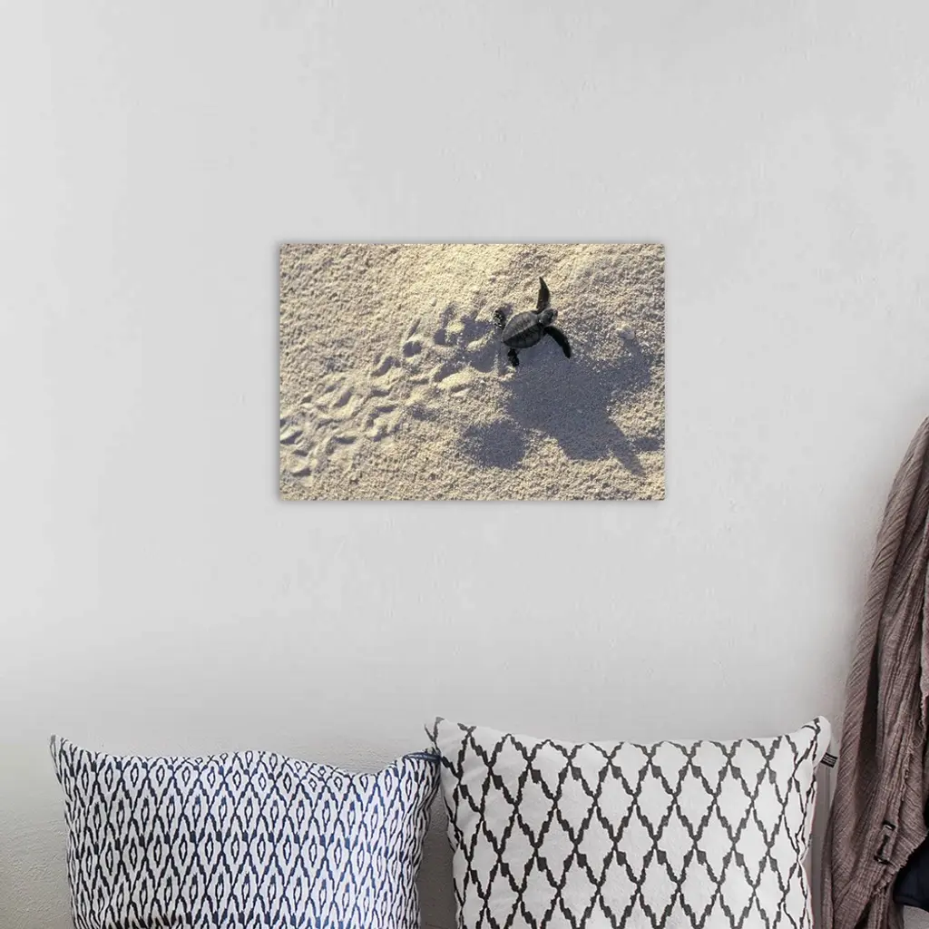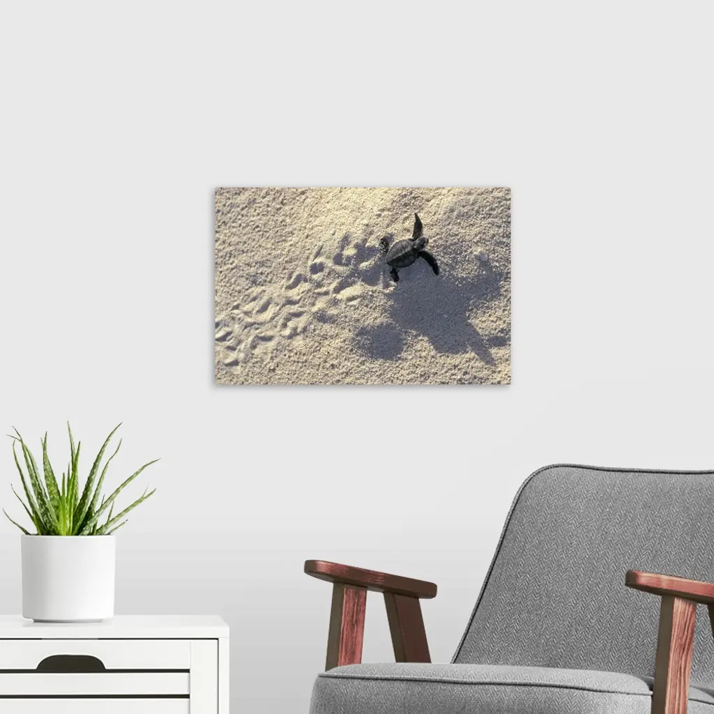 Landscape, oversized photograph of a baby sea turtle making its way across the sand, its fin prints trailing behind.