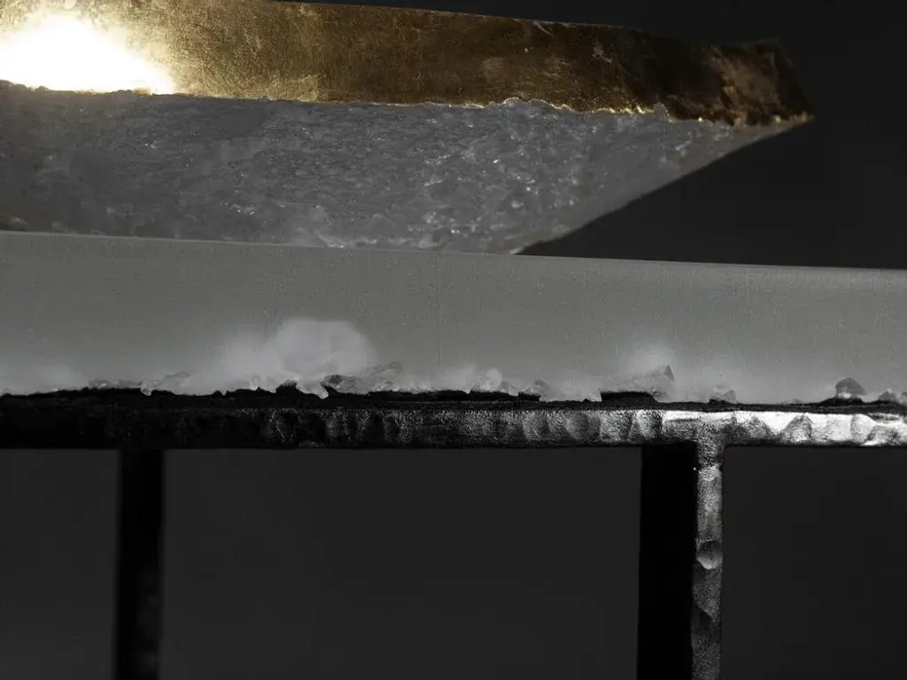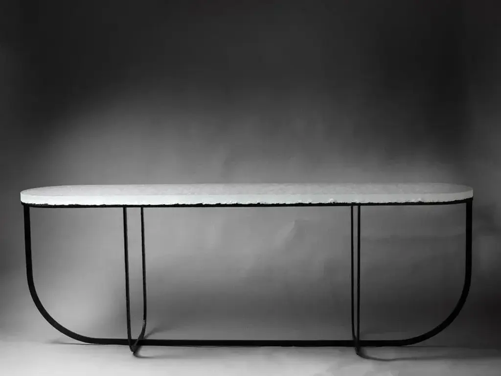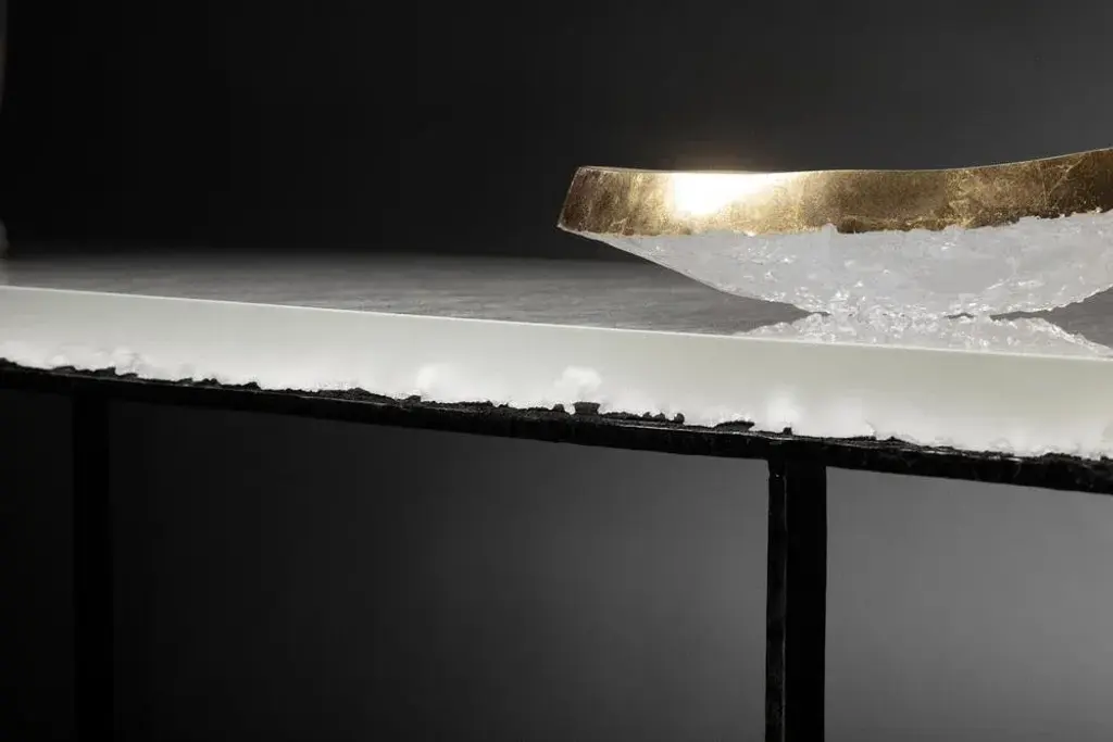 Yugen console by matthieu gicquel dimensions: d 50 x w 230 x h 80 cm. Materials: optical glass and patinated metal. Weight: 140 kg. Each piece is numbered. Please contact us. Praise for the moment light shines through the glass. Details are revealed one by one: here a light bubble rises, there a changing reflection. To seek to understand matthieu gicquel’s glass art - because what we’re really talking about here is touching the senses of the material, of the work - is first and foremost to follow the path mapped out by junichiro tanizaki in in praise of shadows. For him, «[\.] we forget what is invisible to us, we regard as non-existent what cannot be seen»; yet the creator’s entire will lies in this need to reveal to us what seems absent, to give substance to the mystery from a material so common that we no longer pay attention to it. Two words-concepts of japanese origin-form the original basis of matthieu gicquel’s artistic philosophy: wabi-sabi and yûgen. The first is the powerful idea that beauty is to be found in the banal, the everyday, the vile. To the european eye, at first glance, it seems hard to grasp: what beauty is there in a chipped bowl, in pronounced wear and tear? but then\. The everyday and the commonplace contain within them the sublime. But the evidence of beauty, its subtlety, is intrinsic to the object and above all to the way it is viewed. That’s the whole idea behind yûgen: each object is a universe in itself, but it’s up to the viewer to let themselves be caught up in its mystery. At the crossroads of these two concepts, we are talking here about a meditative state, taking time, slowing down. Sitting down, contemplating one of matthieu gicquel’s creations, letting yourself be carried away by a colour changing with the light, by a reflection, a ray. A glass object is a moment when the mind wanders, discovering details and minute variations. A creation is a ray of sunlight on the skin when you wake up in the morning. The work of the glassmaker is extreme formal simplicity combined with the complexity of the soul and the eye. And like leonardo da vinci, matthieu gicquel brings us to the truth that simplicity is the ultimate sophistication. And through it, the designer’s art encourages us to open our minds. Pierre soulages would say that «the sacred (is) there for everyone, including people who are not believers». In fact, there is a sacred dimension to the glassmaker’s work in that, through its contemplative function, it leads to an elevation of the soul, a transcending of the mundane (though very much present in the material itself, in its pragmatism) to touch on the spiritual. All that remains now is to take the time to look out, to apprehend what our eyes cannot see and contemplate, finally, to discover beyond what is no longer just a simple piece of glass.