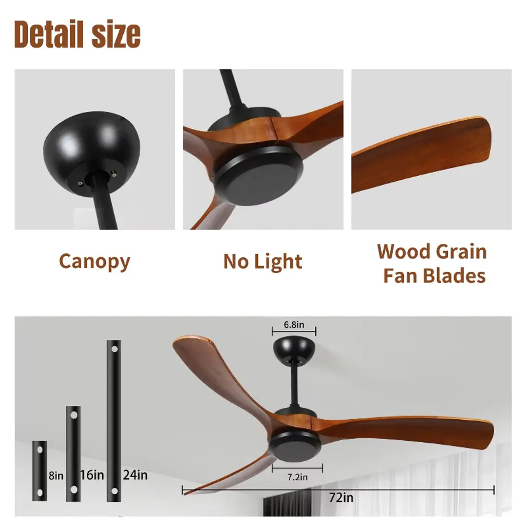 72‘’ Wood Ceiling Fan No light for Medium-sized Room:This 72 inch ceiling fan NO Light has 3 Carved Solid Wood Blades.It offers a morden and elegant style and more powerful wind.Ideal for medium-sized bedroom, living room, dining room, garage, barn, or covered patio area at 21ft*21ft.