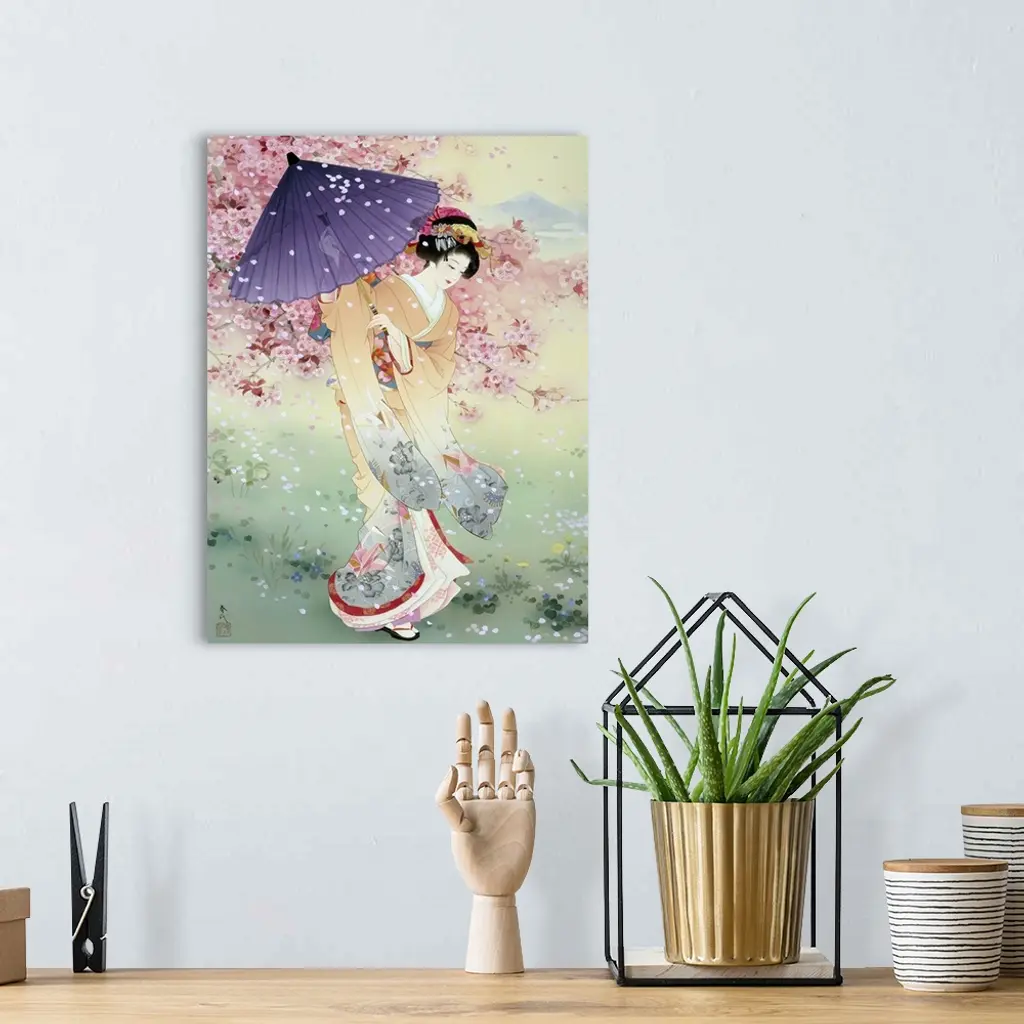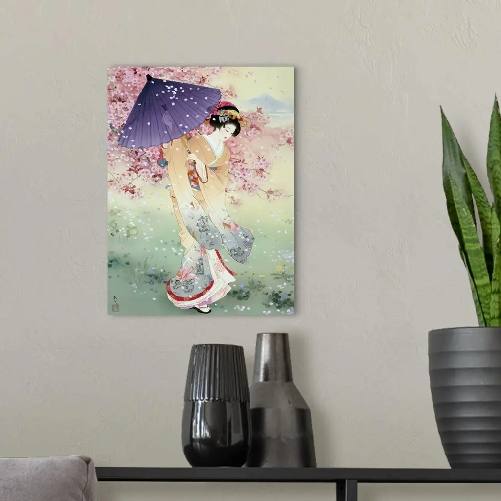 Contemporary colorful Asian art of a Geisha in beautiful ornate clothing.