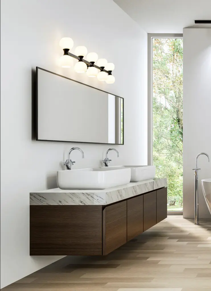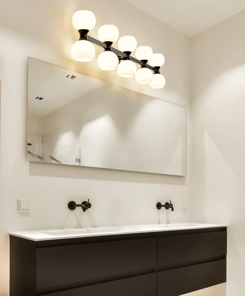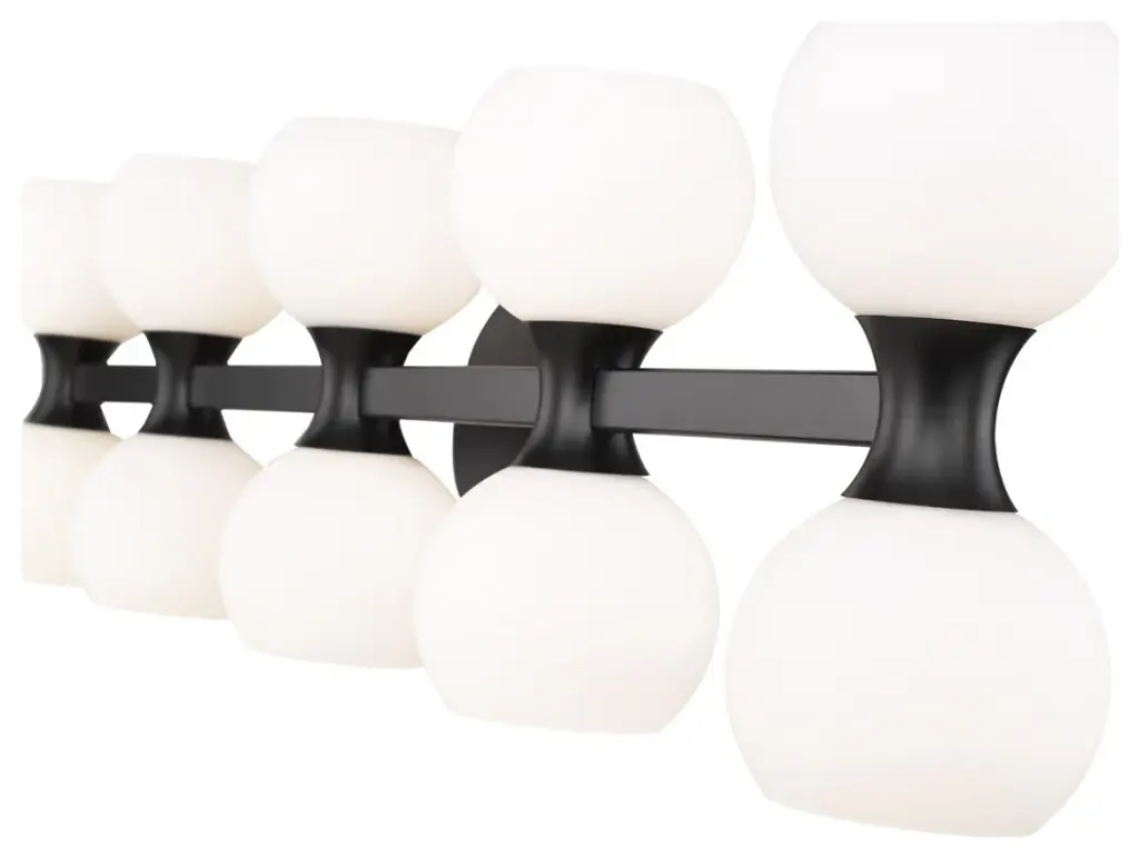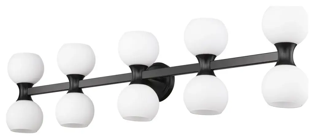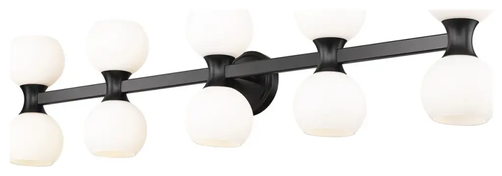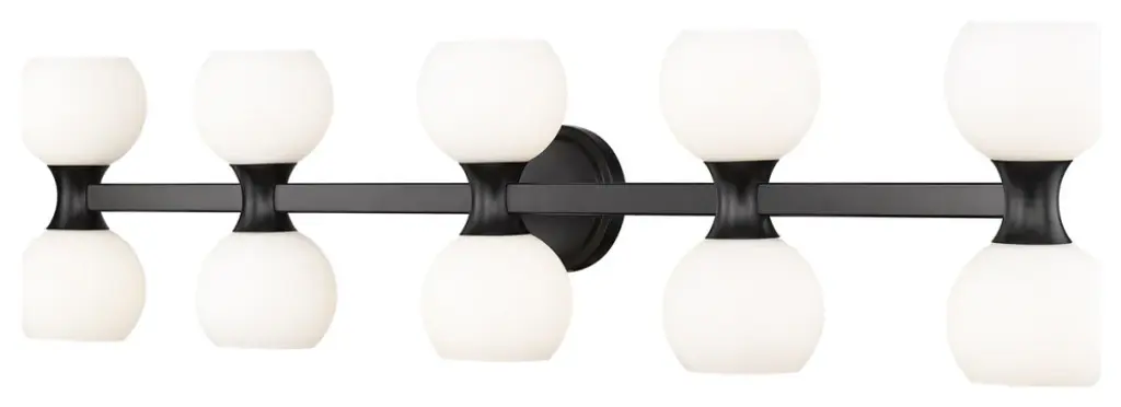 Z-LITE 494-10V-MB 10-Light Vanity, Matte BlackStyle: Mid-Century Modern, Scandinavian, ClassicCollection: ArtemisFrame Finish: Matte BlackFrame Material: SteelShade Finish/Color: Matte OpalShade Material: GlassDimension(in): 45(L) x 6.5(W) x 10.75(H)Backplate Dimension(in): 5"(L) x 5"(W)Bulb: (10)60W Candelabra Base,Dimmable(Not Included)Vanity/Sconce Dual Mount (Up And Down): YesUL Classification: UL/ CUL CertifiedUL Application: Damp.