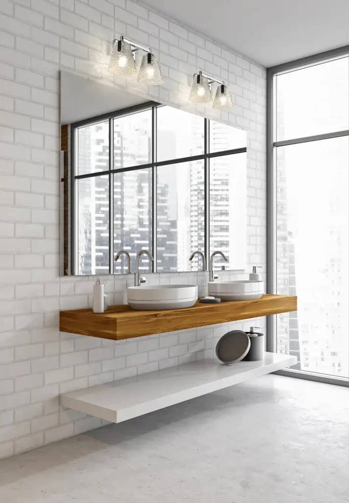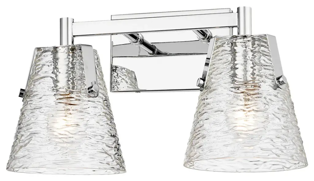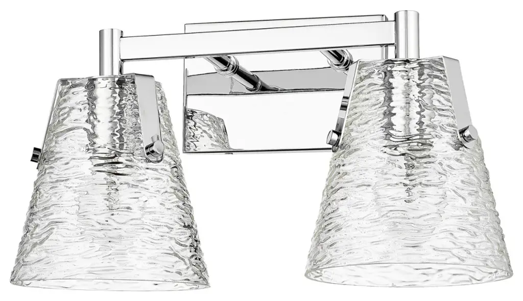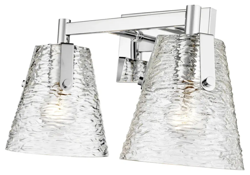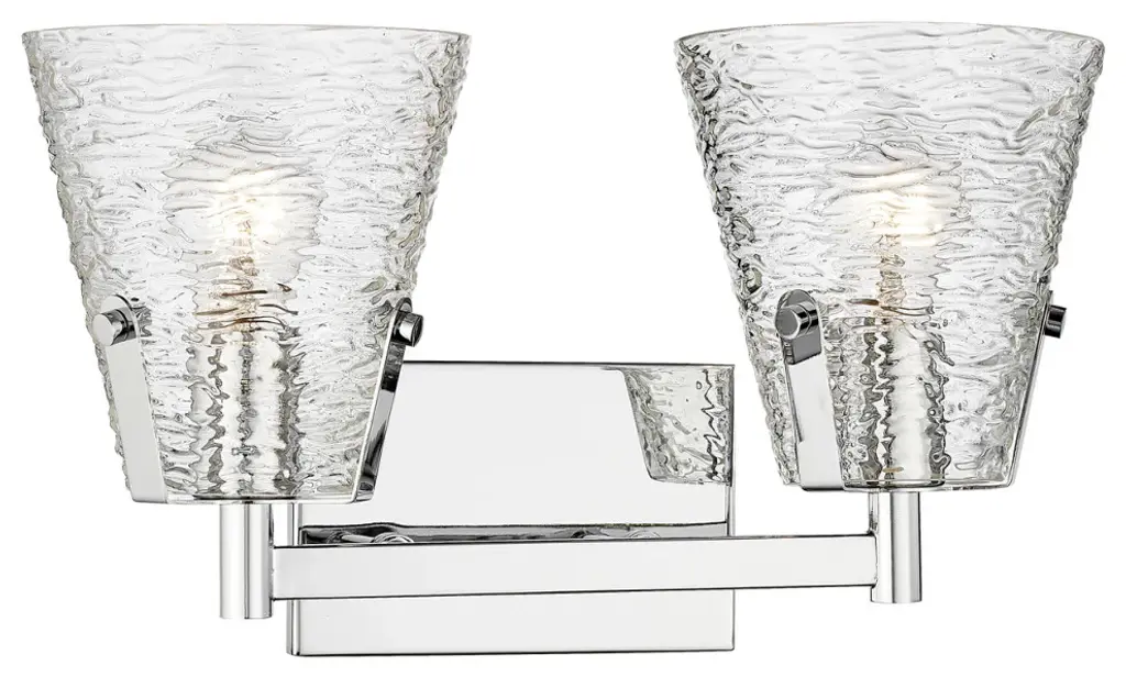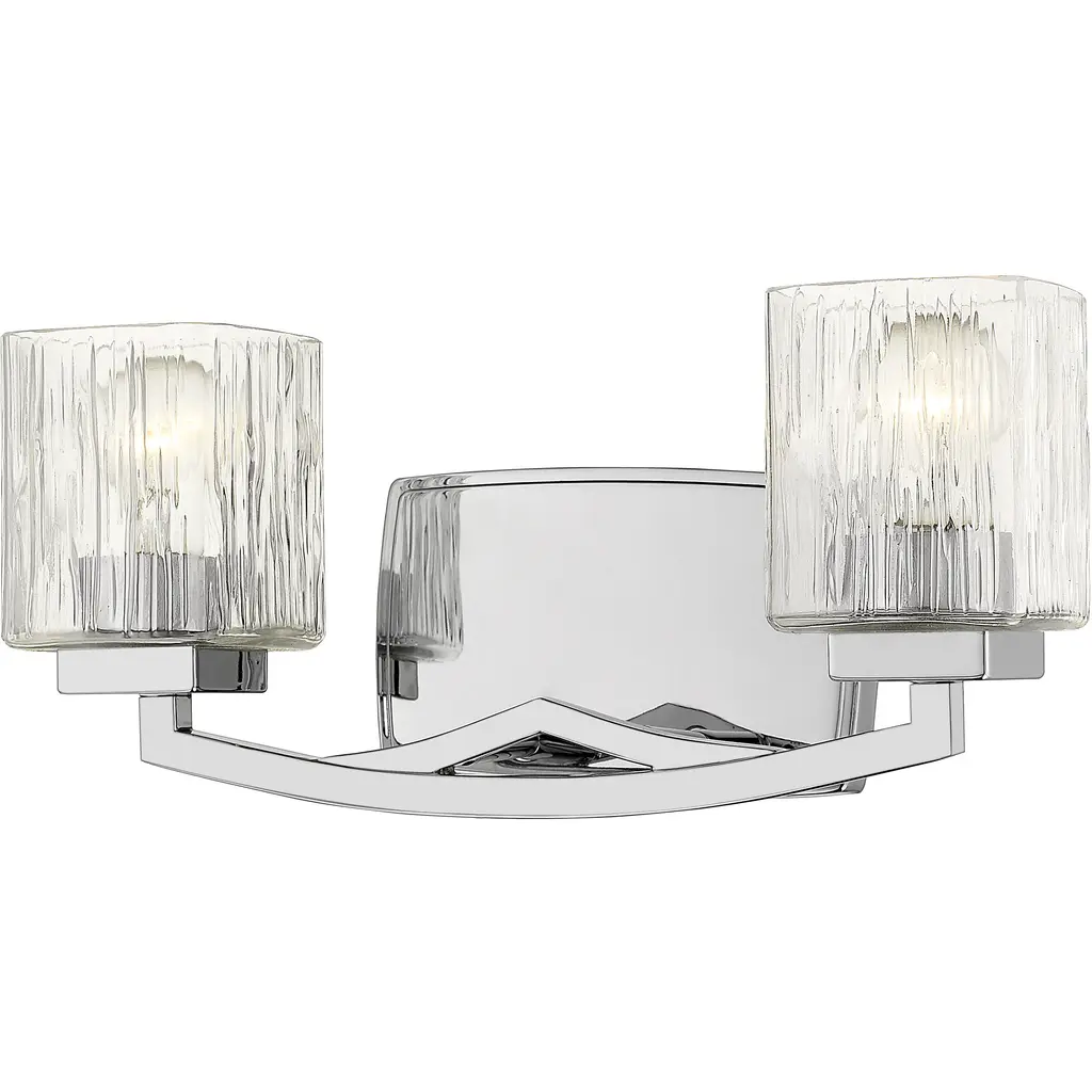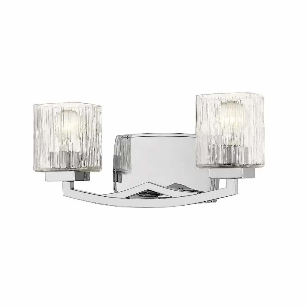 Z-LITE 1101-2V-CH 2-Light Vanity, ChromeStyle: Transitional, Modern, Glass, OrganicCollection: AnaliaFrame Finish: ChromeFrame Material: SteelShade Finish/Color: Clear RibbedShade Material: GlassDimension(in): 7.5(L) x 16.5(W) x 9.25(H)Backplate Dimension(in): 7.01"(L) x 4.53"(W)Bulb: (2)100W Medium Base,Dimmable(Not Included)Vanity/Sconce Dual Mount (Up And Down): YesUL Classification: UL/ CUL CertifiedUL Application: Damp.