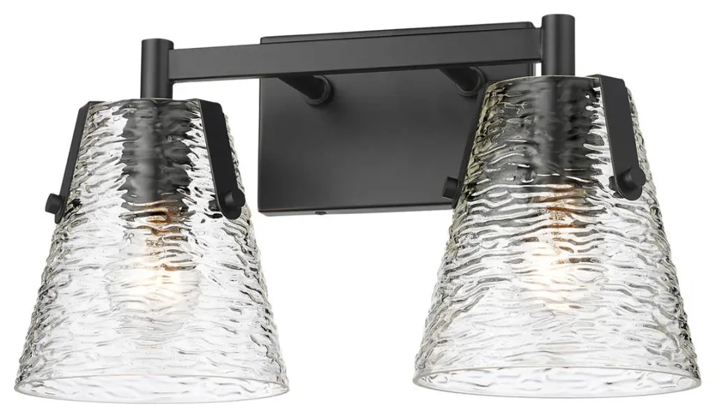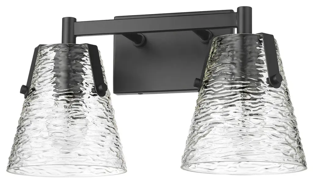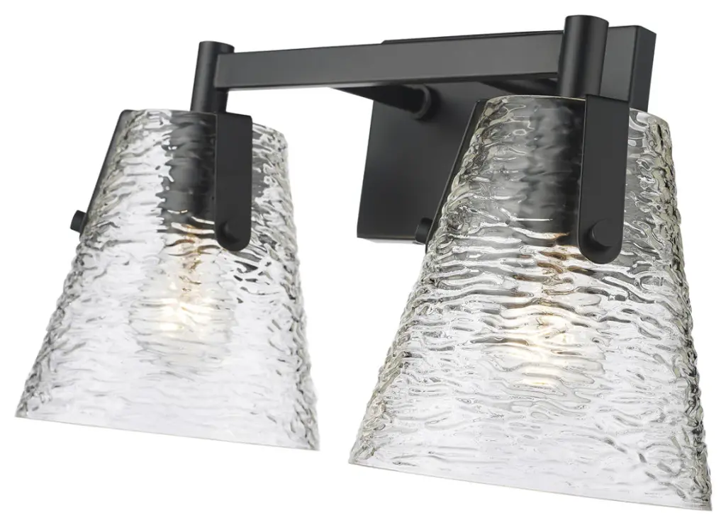 Z-LITE 1101-2V-MB 2-Light Vanity, Matte BlackStyle: Transitional, Modern, Glass, OrganicCollection: AnaliaFrame Finish: Matte BlackFrame Material: SteelShade Finish/Color: Clear RibbedShade Material: GlassDimension(in): 7.5(L) x 16.5(W) x 9.25(H)Backplate Dimension(in): 7.01"(L) x 4.53"(W)Bulb: (2)100W Medium Base,Dimmable(Not Included)Vanity/Sconce Dual Mount (Up And Down): YesUL Classification: UL/ CUL CertifiedUL Application: Damp.