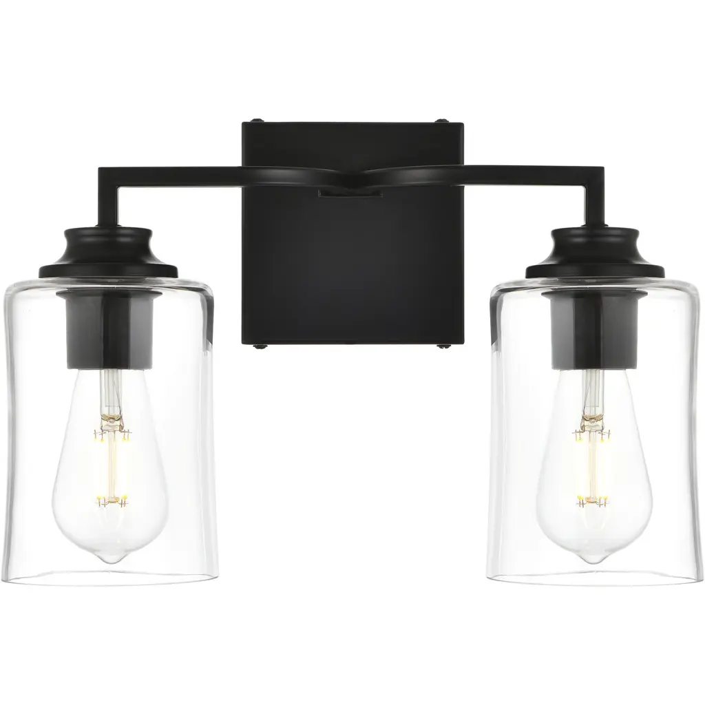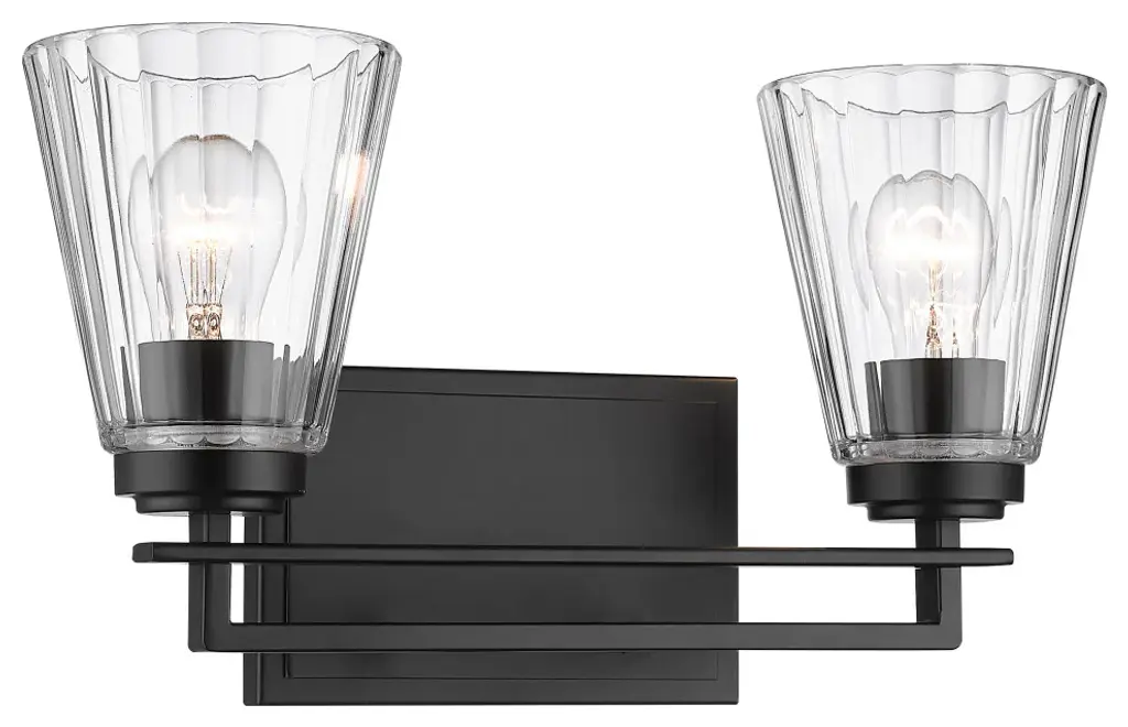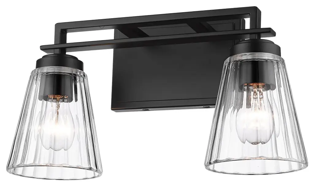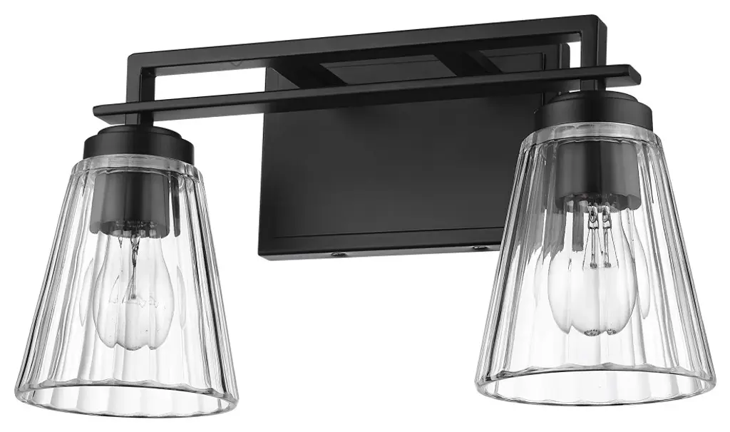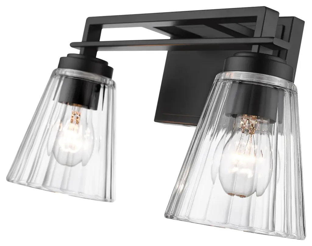 Z-LITE 823-2V-MB 2-Light Vanity, Matte BlackStyle: Transitional, Classic, Glass, RestorationCollection: LynaFrame Finish: Matte BlackFrame Material: SteelShade Finish/Color: ClearShade Material: GlassDimension(in): 6.5(L) x 16(W) x 9(H)Backplate Dimension(in): 5"(L) x 7.5"(W)Bulb: (2)100W Medium Base,Dimmable(Not Included)Vanity/Sconce Dual Mount (Up And Down): YesUL Classification: ETLUL Application: Damp.