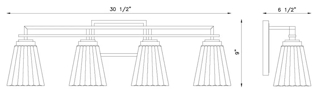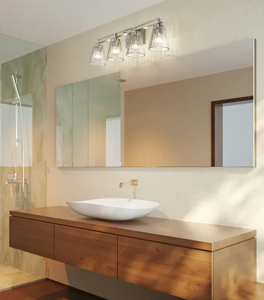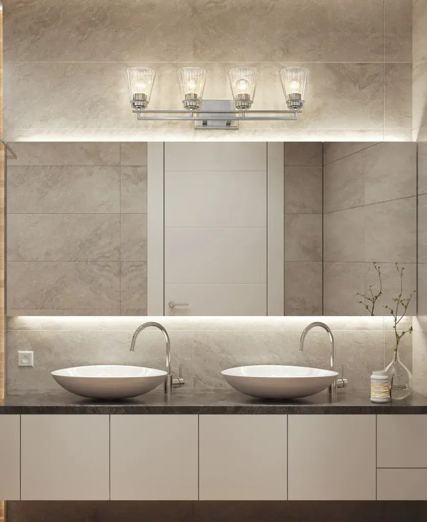 Z-LITE 823-4V-BN 4-Light Vanity, Brushed NickelStyle: Transitional, Classic, Glass, RestorationCollection: LynaFrame Finish: Brushed NickelFrame Material: SteelShade Finish/Color: ClearShade Material: GlassDimension(in): 6.5(L) x 30.5(W) x 9(H)Backplate Dimension(in): 5"(L) x 7.5"(W)Bulb: (4)100W Medium Base,Dimmable(Not Included)Vanity/Sconce Dual Mount (Up And Down): YesUL Classification: ETLUL Application: Damp.