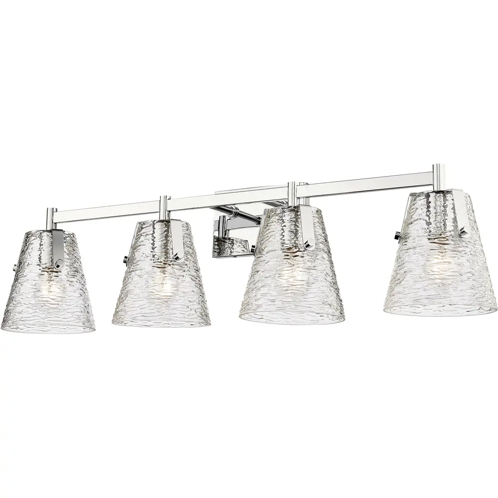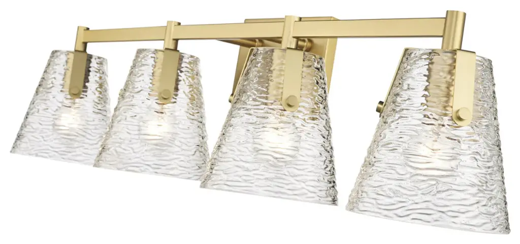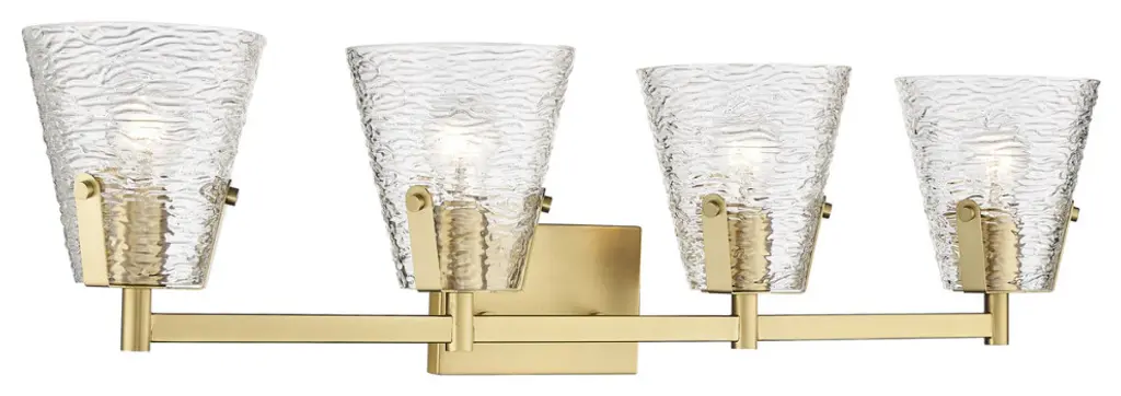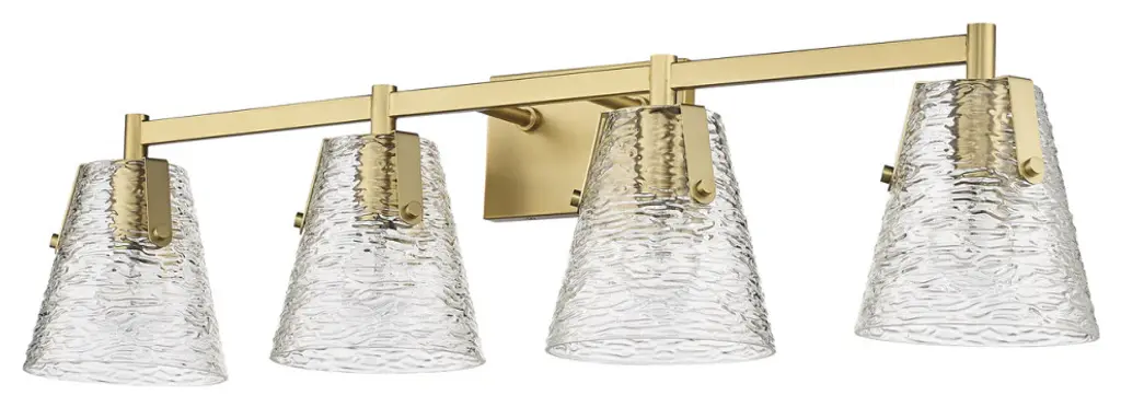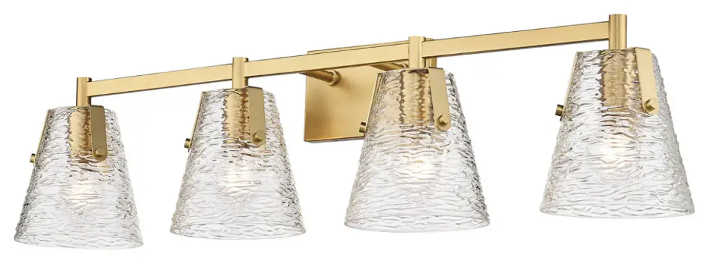 Z-LITE 1101-4V-MGLD 4-Light Vanity, Modern GoldStyle: Transitional, Modern, Glass, OrganicCollection: AnaliaFrame Finish: Modern GoldFrame Material: SteelShade Finish/Color: Clear RibbedShade Material: GlassDimension(in): 7.5(L) x 36(W) x 9.25(H)Backplate Dimension(in): 7.01"(L) x 4.53"(W)Bulb: (4)100W Medium Base,Dimmable(Not Included)Vanity/Sconce Dual Mount (Up And Down): YesUL Classification: UL/ CUL CertifiedUL Application: Damp.