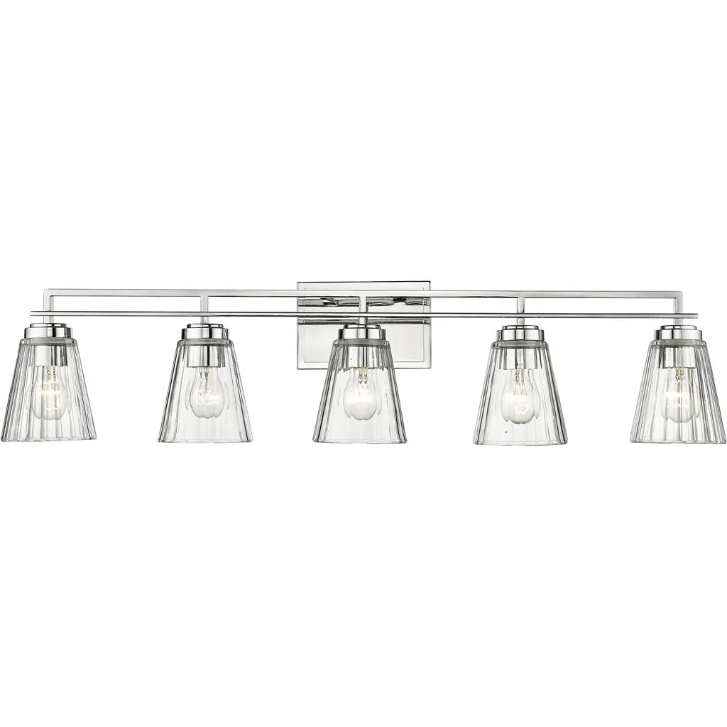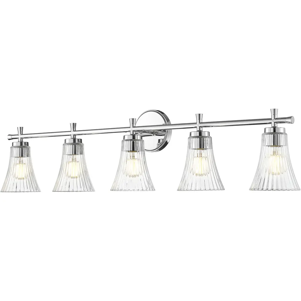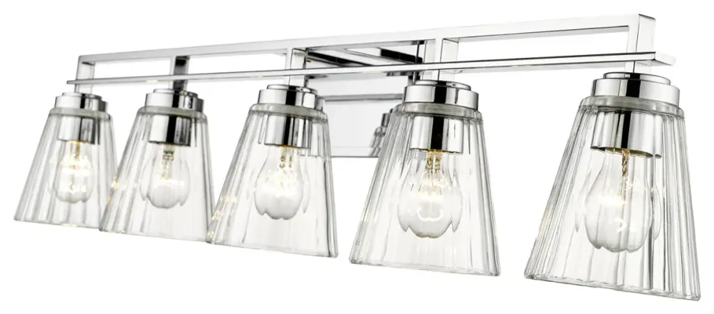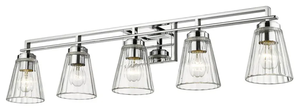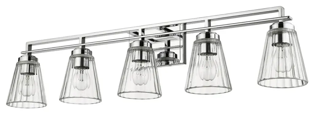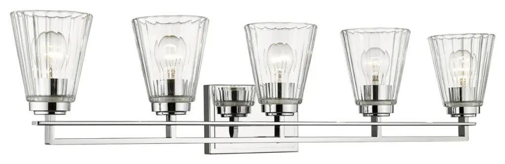 Z-LITE 823-5V-CH 5-Light Vanity, ChromeStyle: Transitional, Classic, Glass, RestorationCollection: LynaFrame Finish: ChromeFrame Material: SteelShade Finish/Color: ClearShade Material: GlassDimension(in): 6.5(L) x 38.75(W) x 9(H)Backplate Dimension(in): 5"(L) x 7.5"(W)Bulb: (5)100W Medium Base,Dimmable(Not Included)Vanity/Sconce Dual Mount (Up And Down): YesUL Classification: ETLUL Application: Damp.