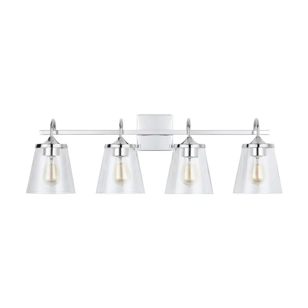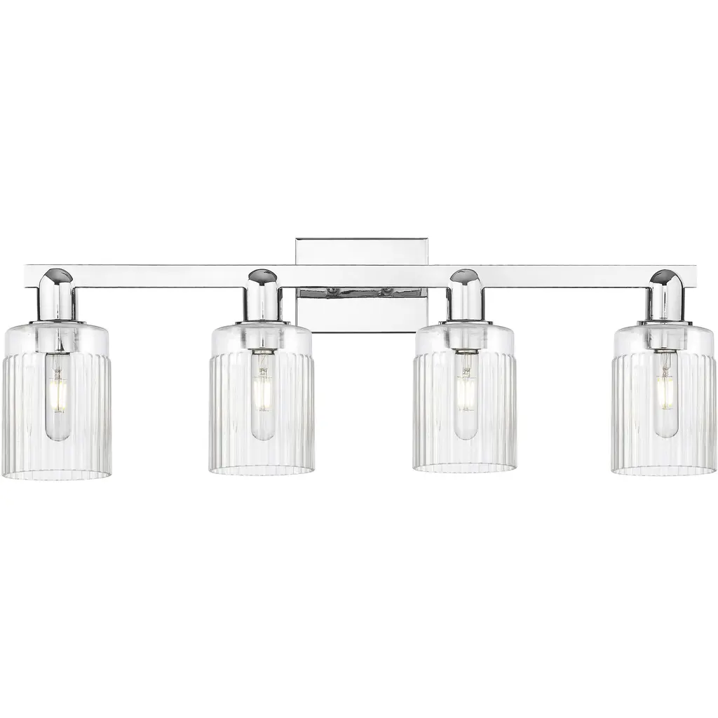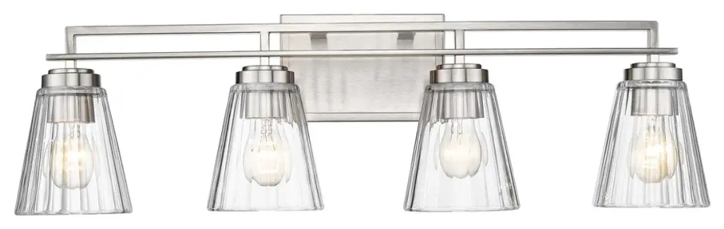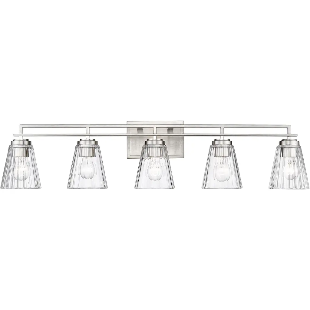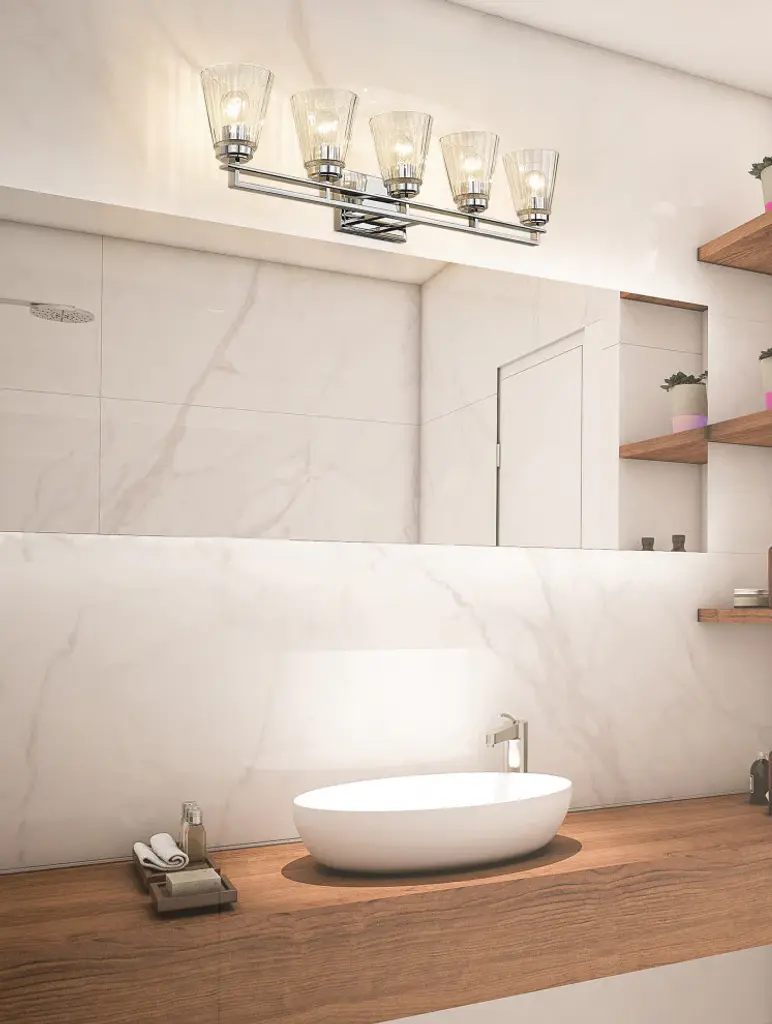Z-LITE 823-5V-CH 5-Light Vanity, ChromeStyle: Transitional, Classic, Glass, RestorationCollection: LynaFrame Finish: ChromeFrame Material: SteelShade Finish/Color: ClearShade Material: GlassDimension(in): 6.5(L) x 38.75(W) x 9(H)Backplate Dimension(in): 5"(L) x 7.5"(W)Bulb: (5)100W Medium Base,Dimmable(Not Included)Vanity/Sconce Dual Mount (Up And Down): YesUL Classification: ETLUL Application: Damp.