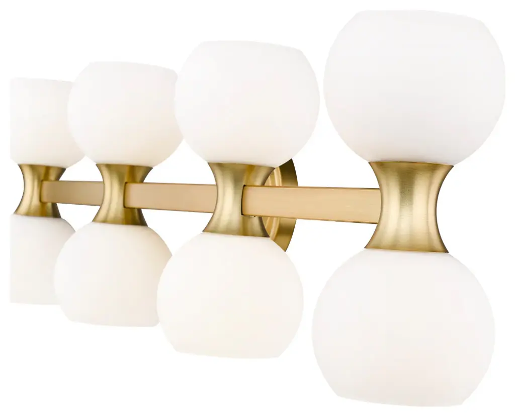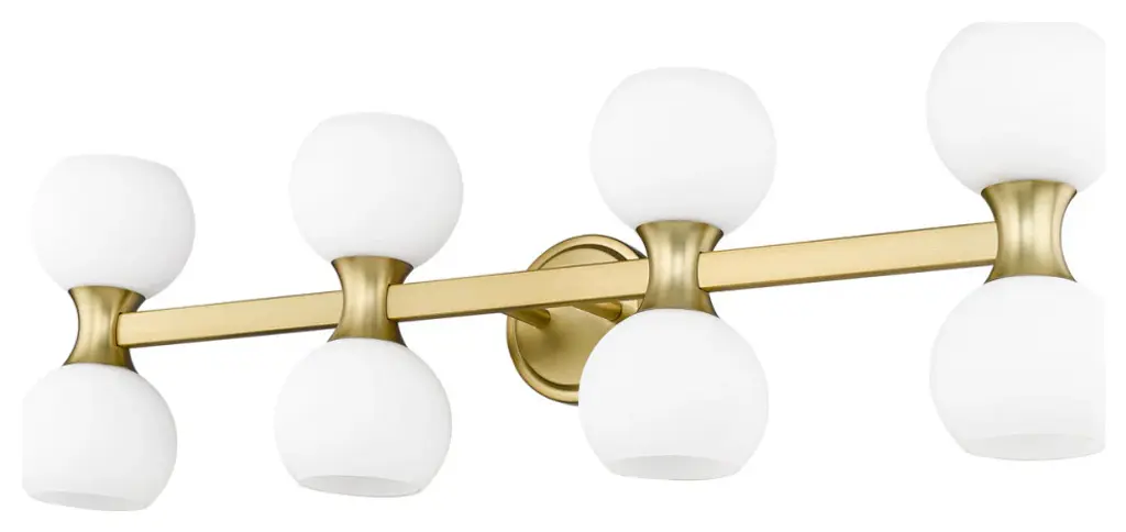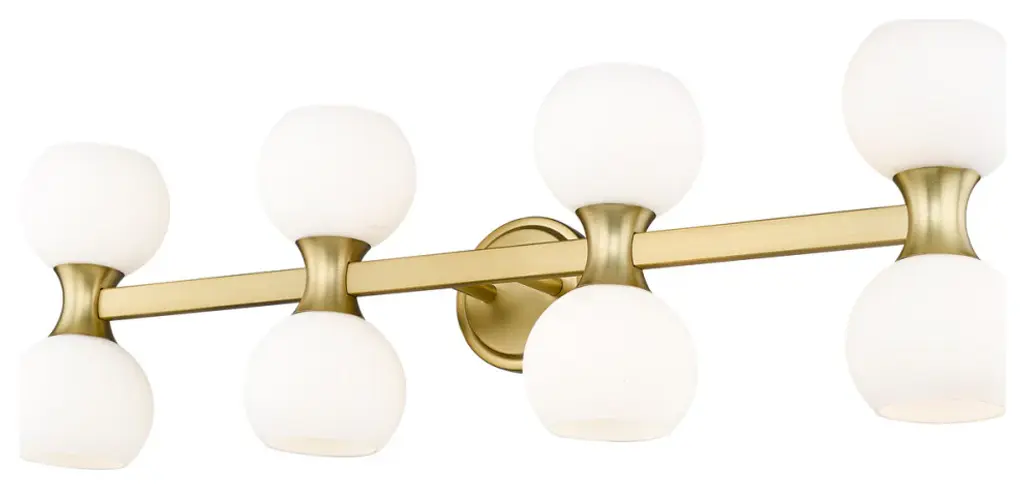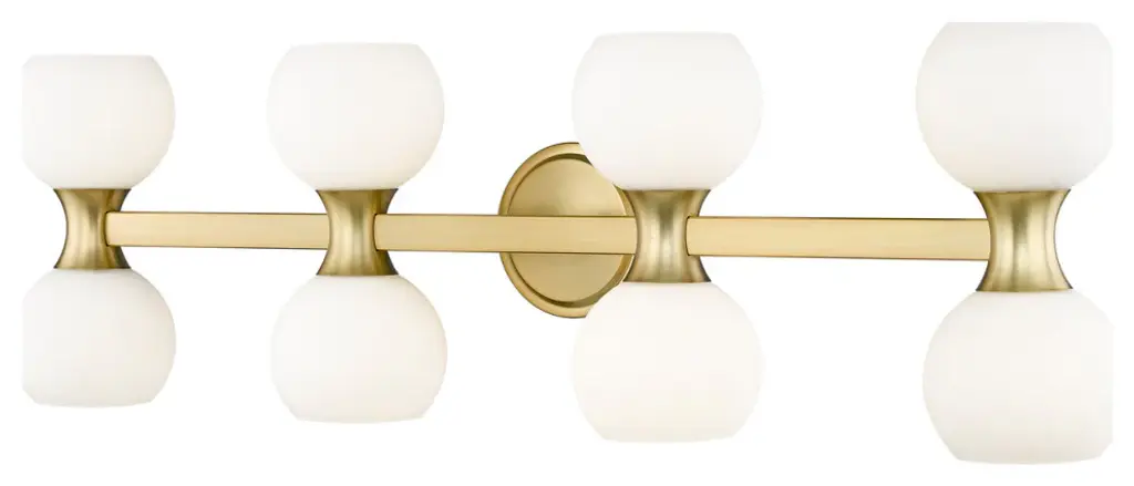 Z-LITE 494-8V-MGLD 8-Light Vanity, Modern GoldStyle: Mid-Century Modern, Scandinavian, ClassicCollection: ArtemisFrame Finish: Modern GoldFrame Material: SteelShade Finish/Color: Matte OpalShade Material: GlassDimension(in): 35(L) x 6.5(W) x 10.75(H)Backplate Dimension(in): 5"(L) x 5"(W)Bulb: (8)60W Candelabra Base,Dimmable(Not Included)Vanity/Sconce Dual Mount (Up And Down): YesUL Classification: UL/ CUL CertifiedUL Application: Damp.