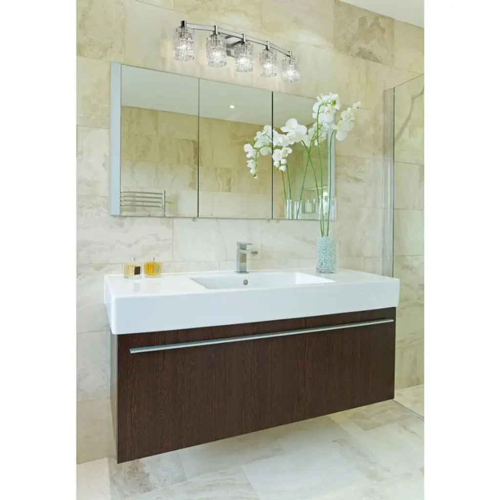 A contemporary haven is bejeweled with glam as this exquisite five-light vanity light becomes a focal point in a modern bath space. Crystal-like glass shades add an air of exclusivity to a fixture with a beautiful Brushed Nickel finish metal mount and arms, and an air of high-class, upscale elegance that frames a decadent vanity. Bathroom/Powder Room Mounting Direction: Up/Down Shade Included: Yes Dimmable: Yes