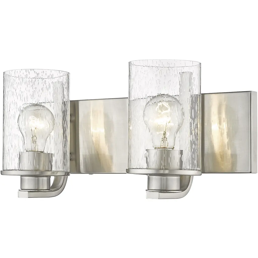 Light up a modern or transitional bath space with this elegant three-light vanity light from the Beckett collection. Showcasing a hint of village nautical fare, its romantic clear seedy glass cylinder shades offer a heady effect. A rectangular steel mount and accents fashioned of classic brushed nickel finish steel deliver a tasteful aesthetic. Dimmable: Yes Shade Included: Yes