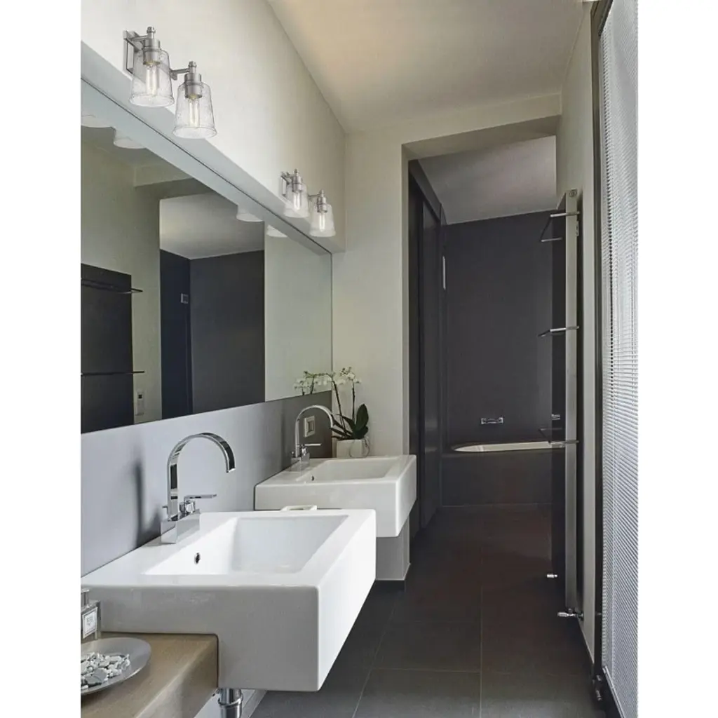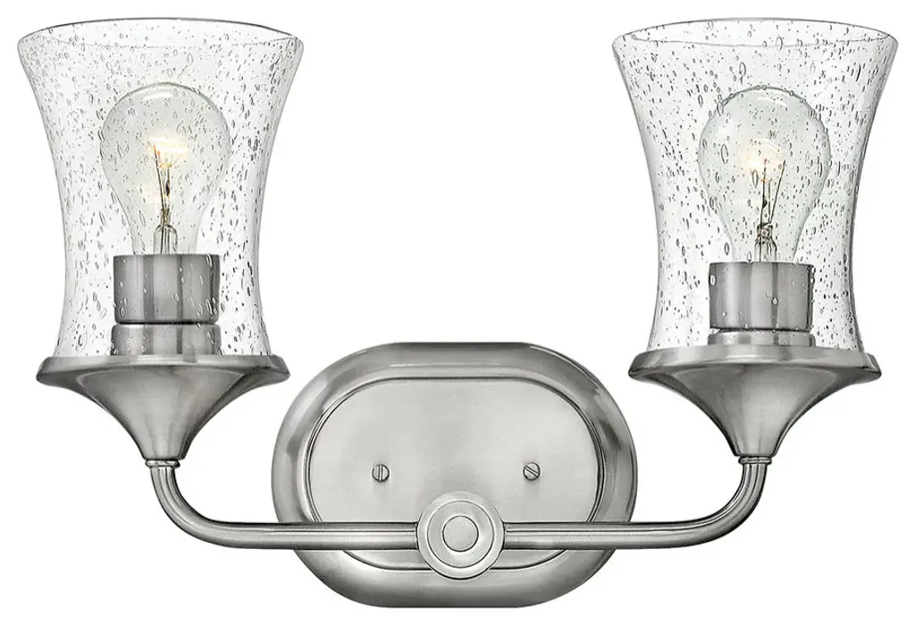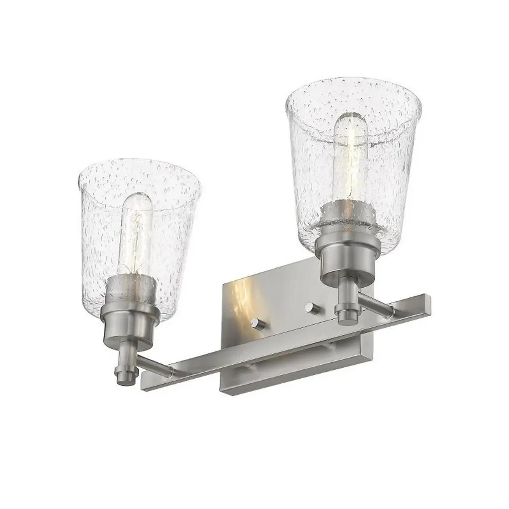The heady effect of clear seedy glass brings a romantic touch to this brushed nickel finish two-light vanity light. Enjoy an elegance that comes from classic design detailing on its steel frame, and a versatile way to add extra illumination to a contemporary or transitional space. Room Recommendation: Bathroom/Powder Room Mounting Direction: Up/Down Dimmable: Yes Shade Included: Yes