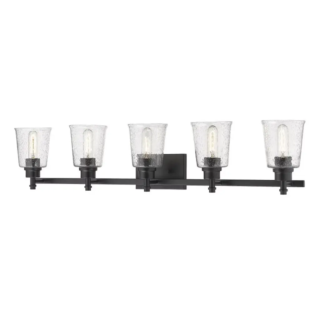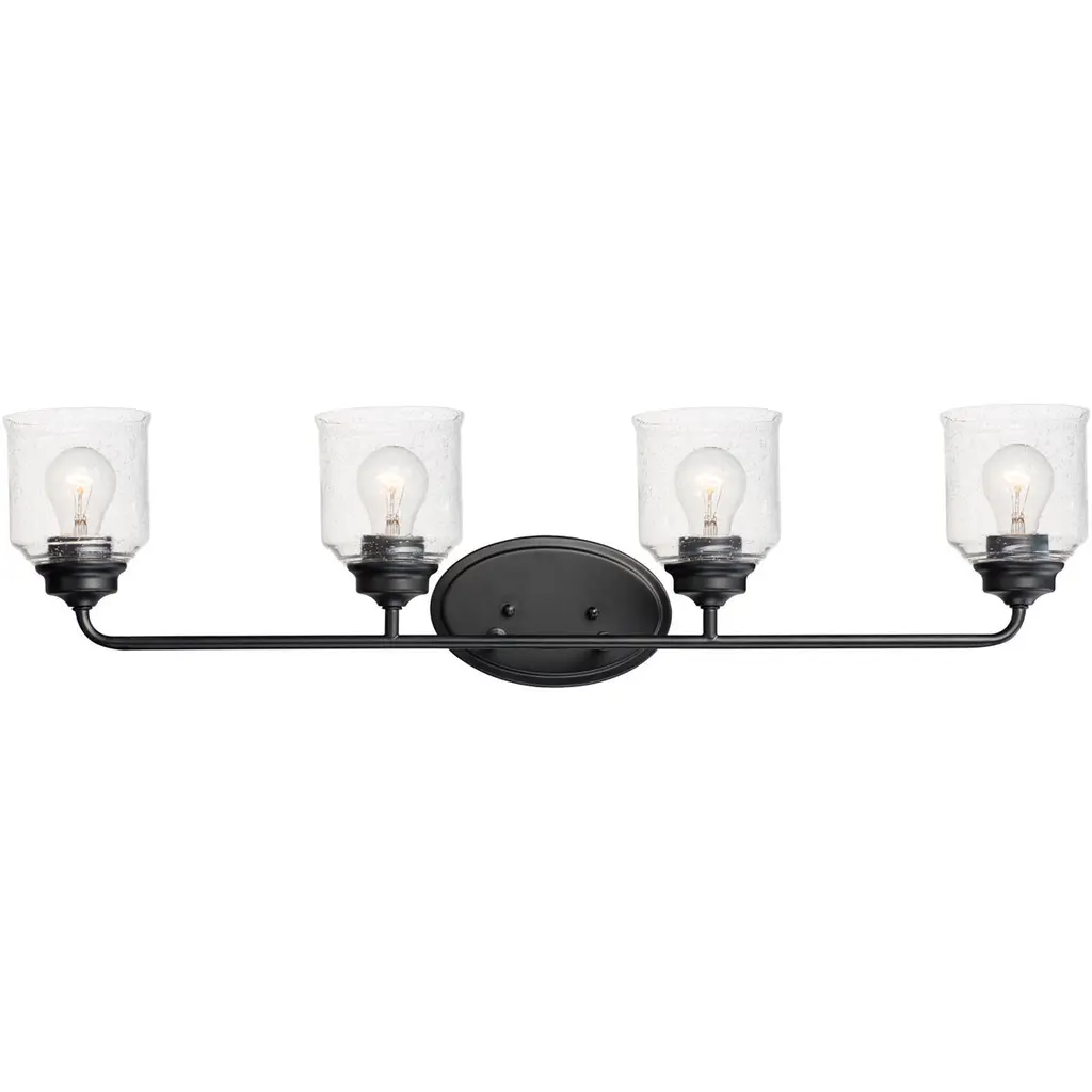 Frame a master or guest bath sink with elegance, and add this brushed nickel four-light vanity light to a new or remodeled bath space. Contemporary and transitional, its versatile motif hits on a beautiful blend of durable steel and soft, delicate bell shades fashioned from clear seedy glass. Bathroom/Powder Room Mounting Direction: Up/Down Shade Included: Yes Dimmable: Yes