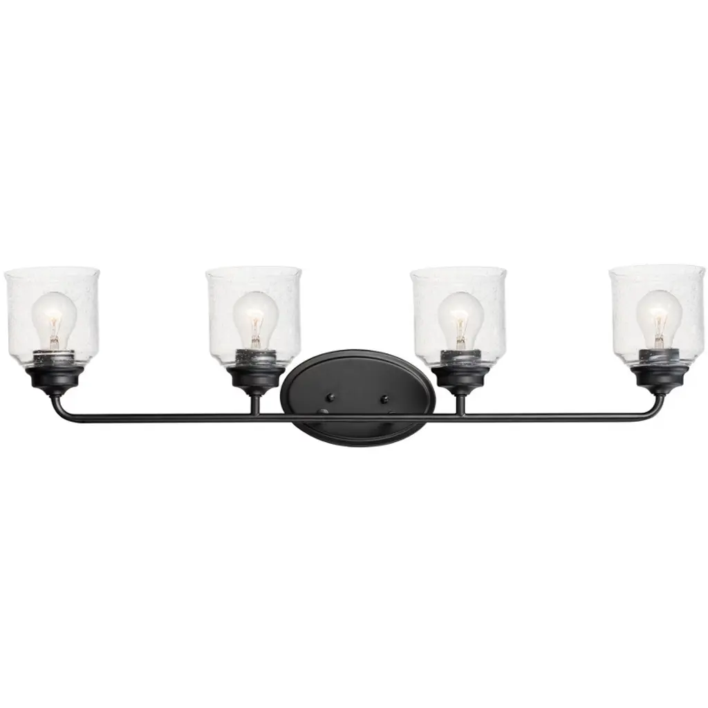 A master en suite gains exceptional elegance with this brushed nickel five-light vanity light. Enjoy the artistic and architectural design of a stunning fixture with clear seedy glass shades, offering a perfect fit to both contemporary and transitional decor schemes. Bathroom/Powder Room Mounting Direction: Up/Down Shade Included: Yes Dimmable: Yes Material: Glass, Finish Color: Brushed Nickel, Width: 41.25", Height: 8.5", Length: 6.5", Depth: 6.5", Backplate Width: 4.5", Backplate Length: 7.25", Lamping Type: Incandescent, Number Of Bulbs: 5, Wattage: 100 Watts, Dimmable: Yes, Moisture Rating: Damp Rated
