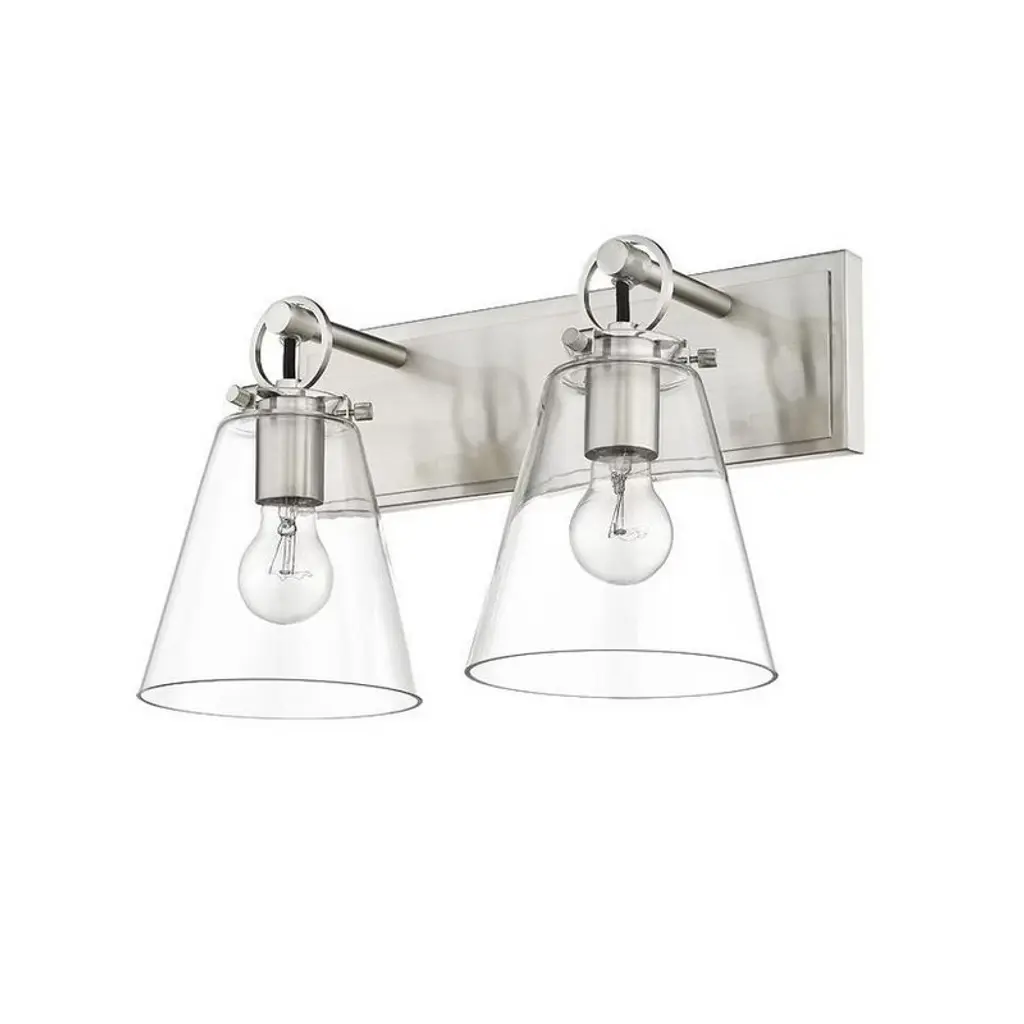 Create a stunning look of fresh design when adding ambient lighting to a custom bath space. Contemporary and inviting, this two-light vanity bath light from the Harper collection keeps it simple yet decadent with a sleek brushed nickel finish over steel composing a rectangular wall mount and accents. Clear glass conical shades add a hint of nautical inspiration. Dimmable: Yes Shade Included: Yes