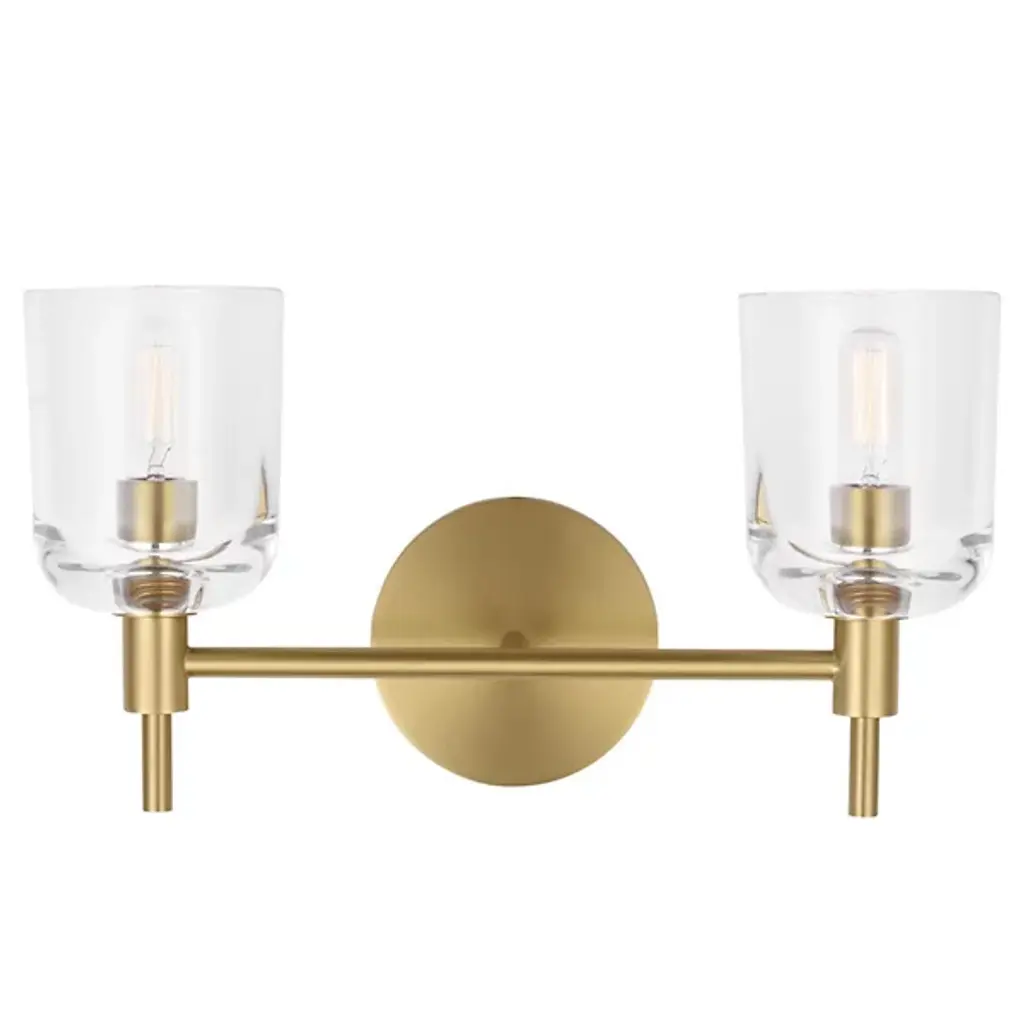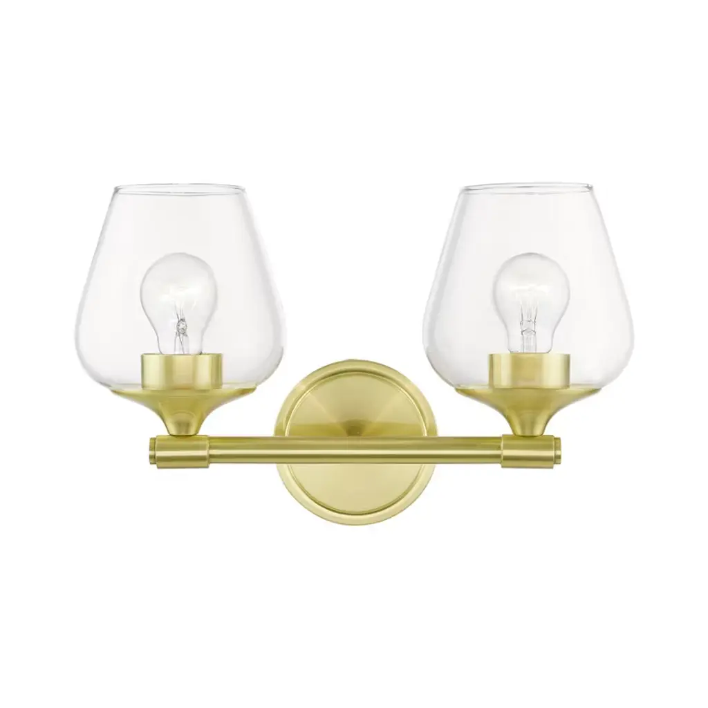Upscale sophistication with a Mid Century Modern vibe tells the story of this elegant two-light vanity light. A blend of delightful materials offers stunning large glass shades with Brushed Nickel finish metal, delivering a versatile palette that embellishes the look of any transitional bath space. Bathroom/Powder Room Mounting Direction: Up/Down Shade Included: Yes Dimmable: Yes