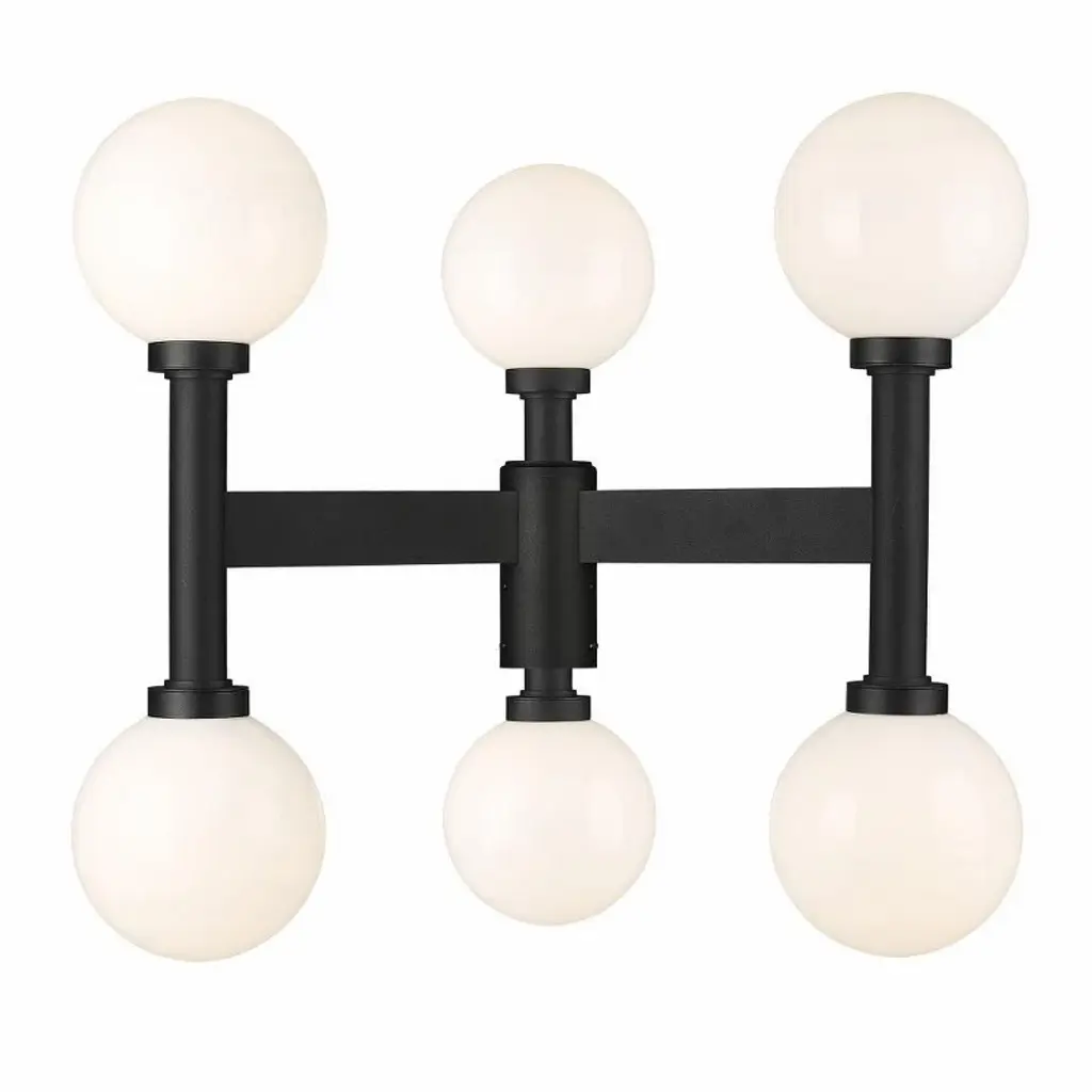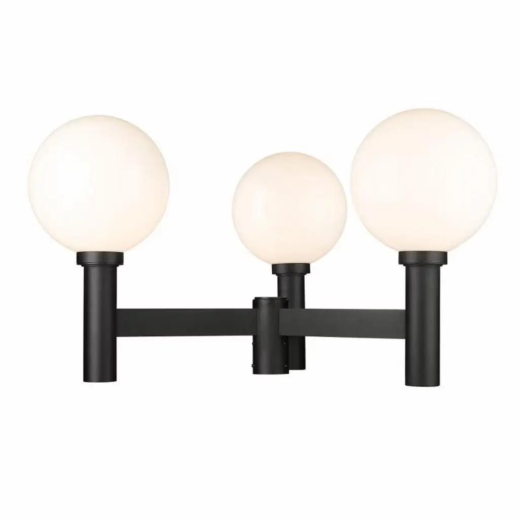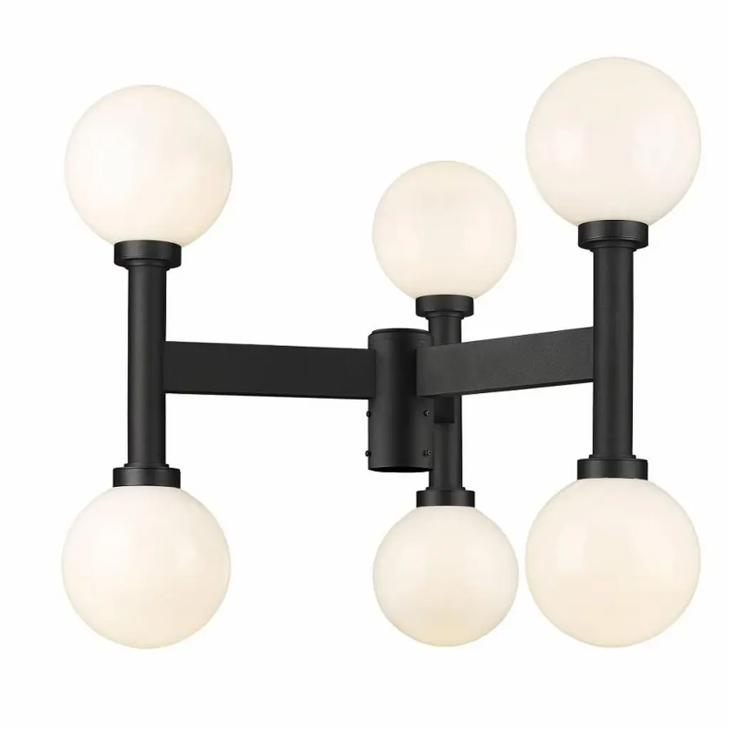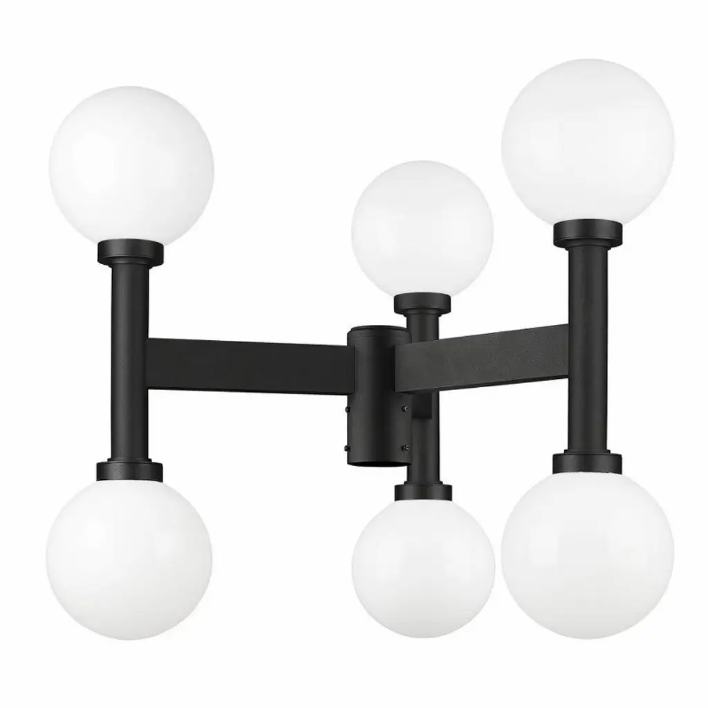 Perfect for large exterior spaces needing extra reach in illumination, the Laurent six-light outdoor post mount fixture offers a charming aesthetic with a contrasting palette and whimsical design. Crafted of black finish aluminum, its straight-line frame delivers stellar versatility and a sleek look. Six charming opal glass globes positioned vertically put a retro stamp with festive artistry on this outdoor fixture.