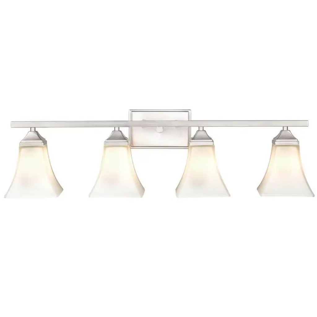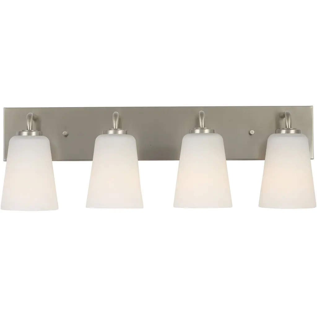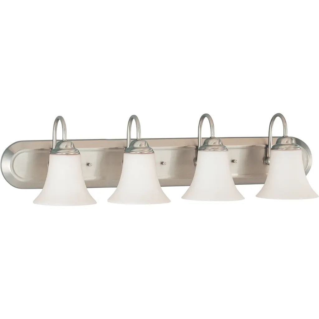 Simply elegant is the best way to describe this four light vanity which features a detailed wall mount finished in brushed nickel and complimented with white swirl glass shades. Bathroom/Powder Room Mounting Direction: Up/Down Shade Included: Yes Dimmable: Yes Material: Steel, Finish Color: Brushed Nickel, Width: 30", Height: 9", Length: 8.75", Depth: 8.75", Backplate Width: 5", Backplate Length: 30", Lamping Type: Incandescent, Number Of Bulbs: 4, Wattage: 60 Watts, Dimmable: Yes, Moisture Rating: Damp Rated