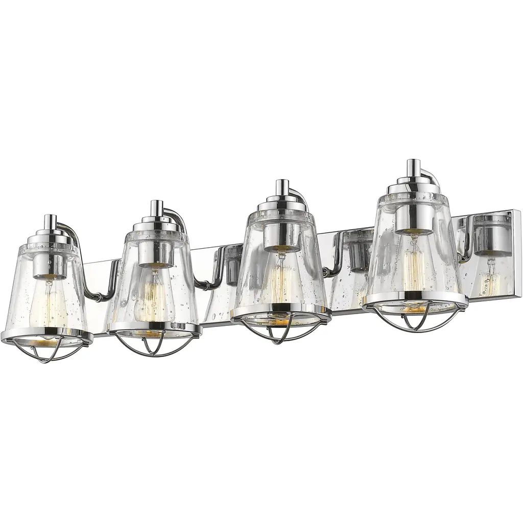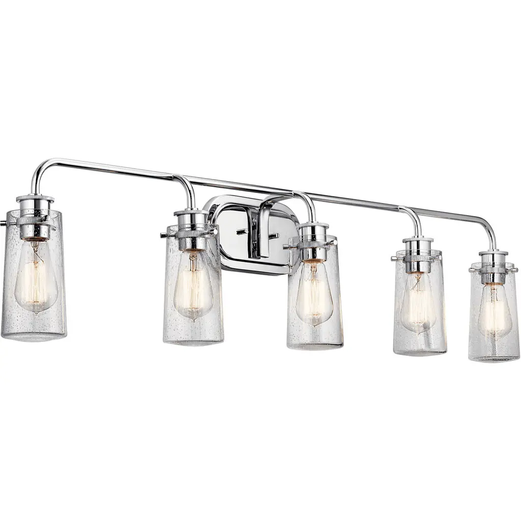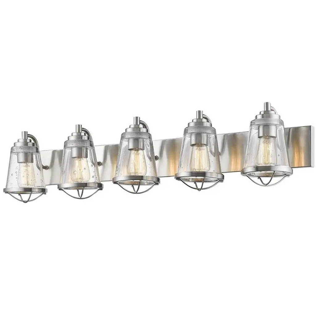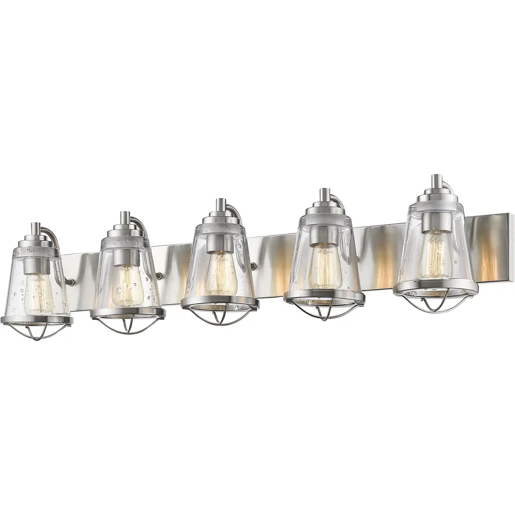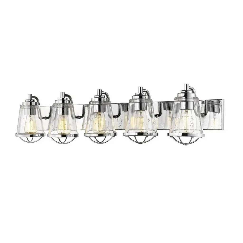 At the center of a contemporary, stylish bath space lies this personality-rich five-light vanity fixture. Indulge in a charming maritime theme that marries sleek chrome finish steel and seedy glass shades, with a dose of ornate metal trim. Bathroom/Powder Room Mounting Direction: Up/Down Shade Included: Yes Dimmable: Yes Material: Steel, Finish Color: Chrome, Width: 40", Height: 8.875", Length: 7.625", Depth: 7.63", Backplate Width: 4.5", Backplate Length: 40", Lamping Type: Incandescent, Number Of Bulbs: 5, Wattage: 100 Watts, Dimmable: Yes, Moisture Rating: Damp Rated