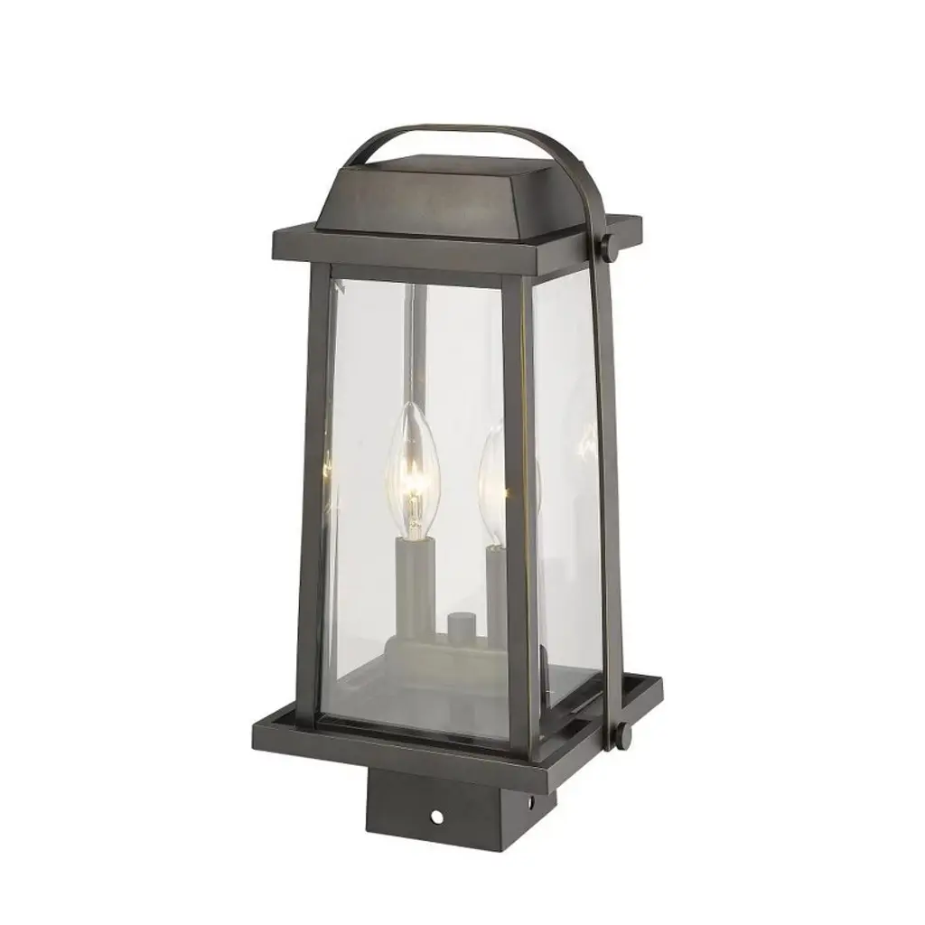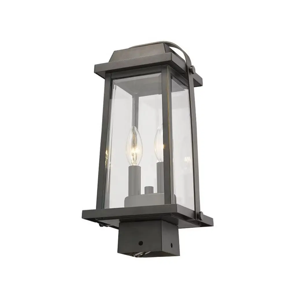 Designed to fit a square post, this outdoor post light lends a touch of classic character to a patio or walkway. An oil rubbed bronze finish complements a familiar lantern silhouette, while two lights behind clear beveled glass ensure exceptional illumination. Outdoor Living/Deck/Patio Shade Included: Yes Dimmable: Yes Material: Glass, Finish Color: Black, Width: 7.75", Height: 15.25", Length: 7", Lamping Type: Incandescent, Number Of Bulbs: 2, Wattage: 60 Watts, Dimmable: Yes, Moisture Rating: Wet Rated