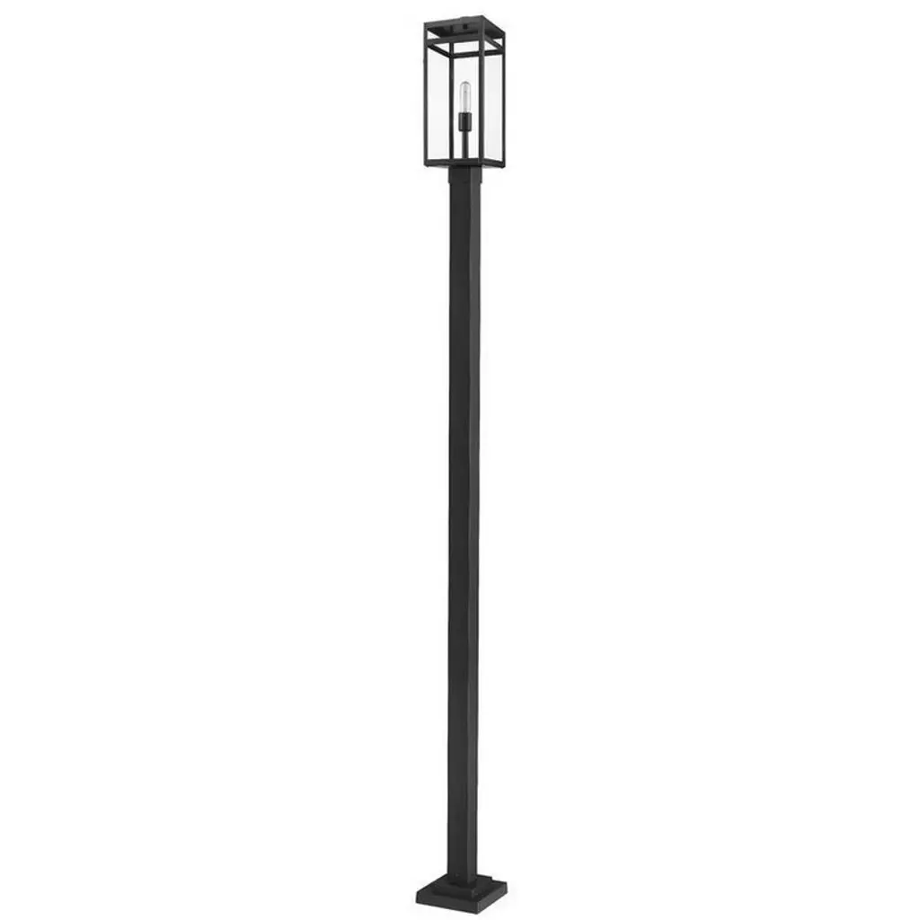 Crisp modern styling embellishes the contemporary vibe of the Nuri one-light outdoor post mounted fixture. Bring an updated source of ambient lighting to a sidewalk or fence space, focusing on geometric elements in a black steel finish frame and matching post and base. Clear glass panels offer a glimpse of a charming slender bulb base. Dimmable: Yes Shade Included: Yes