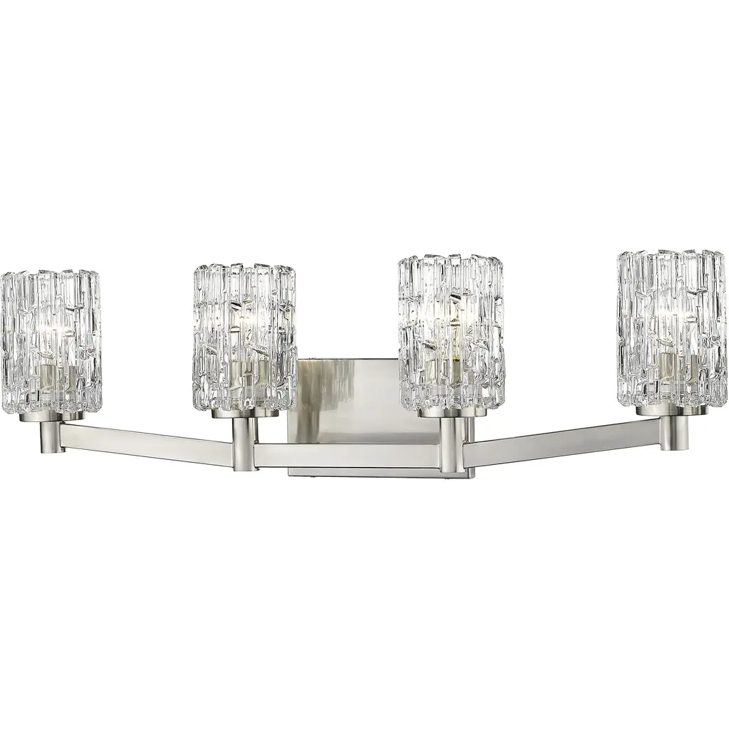 With sleek brushed nickel finish steel construction and clear crystal cut glass shades, this five-light vanity is a natural choice for a casually contemporary bath space. Enjoy an Art Deco influence in its intriguing design and choose surrounding fixtures and accents that make it stand out. Material: Steel, Finish Color: Brushed Nickel, Width: 36", Height: 6.5", Length: 5.25", Depth: 5.25", Backplate Width: 4.75", Backplate Length: 8.75", Lamping Type: Halogen, Number Of Bulbs: 5, Wattage: 75 Watts, Dimmable: Yes, Moisture Rating: Damp Rated