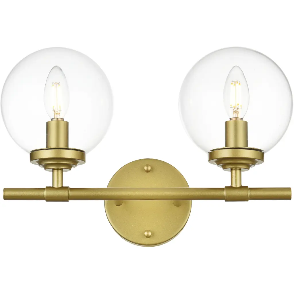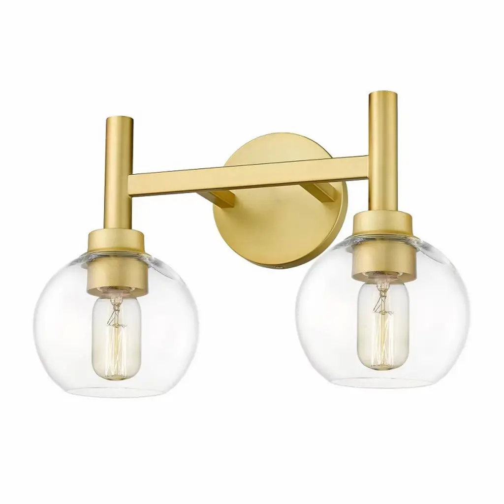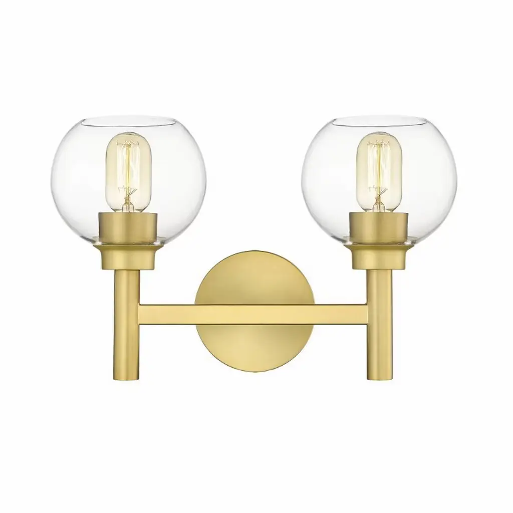 A contemporary two-light vanity sconce boasts graceful curves that create its perfect circle design elements. Its familiar, torch-inspired silhouette is adorned with a brushed gold finish for warm, glamorous flair in an entry or bathroom. A pair of open-edged, clear glass globe shades adds precision, and this fixture can be mounted with lights either up or down to best suit your space and preference.