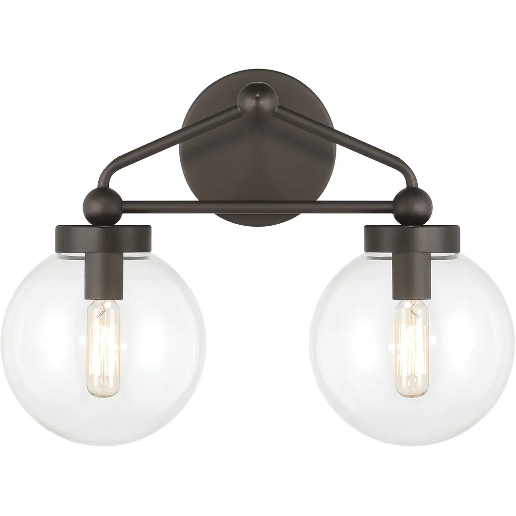 A contemporary two-light vanity sconce boasts graceful curves that create its perfect circle design elements. Its familiar, torch-inspired silhouette is adorned with a brushed gold finish for warm, glamorous flair in an entry or bathroom. A pair of open-edged, clear glass globe shades adds precision, and this fixture can be mounted with lights either up or down to best suit your space and preference.
