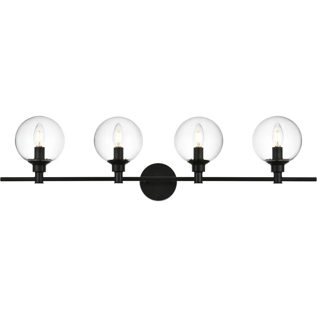 A precise, perfect circle creates the inspirations for the modern ambiance of third contemporary four-light vanity wall light. Designed for the Sutton collection, the sconce showcases four of torch-style lights paired with steel framing and a round wall plate, all in a warm brushed gold finish. A quartet of open-edged globe shades are expertly crafted in thick, clear glass, delivering maximum illumination to your vanity and bathroom space.