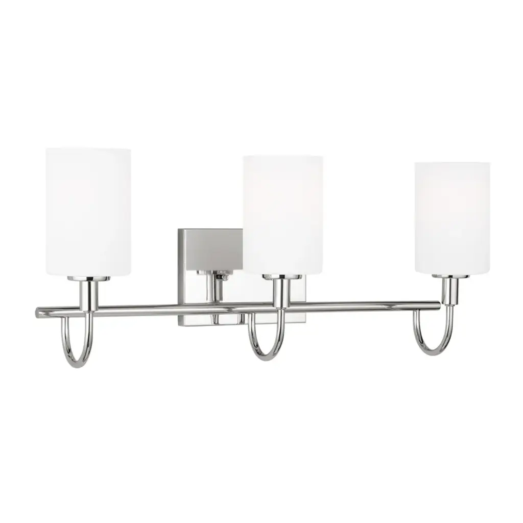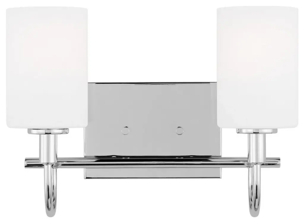 This two light vanity fixture provides a clean modern look with its use of rectangular matte opal shades and chrome geometric inspired hardware. This fixture can either be hung up or down, depending on the needs of the user. Material: Glass, Finish Color: Chrome, Width: 13.25", Height: 8", Length: 5", Depth: 5", Backplate Width: 4.5", Backplate Length: 8", Lamping Type: Incandescent, Number Of Bulbs: 2, Wattage: 100 Watts, Dimmable: Yes, Moisture Rating: Damp Rated