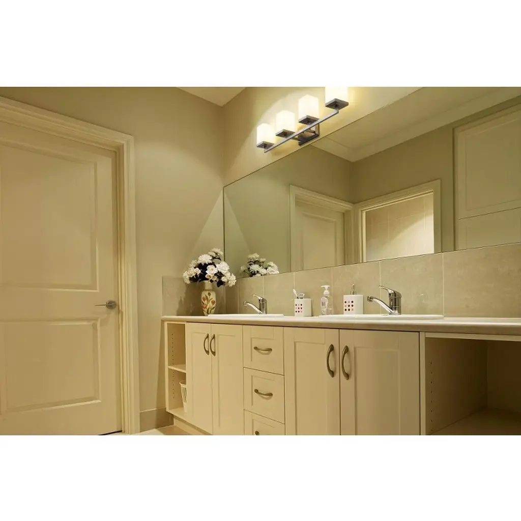 This four light vanity fixture provides a clean modern look with its use of rectangular matte opal shades and brushed nickel geometric inspired hardware. This fixture can either be hung up or down, depending on the needs of the user. Material: Steel, Finish Color: Brushed Nickel, Width: 33.25", Height: 8", Length: 5", Depth: 5", Backplate Width: 4.5", Backplate Length: 8", Lamping Type: Incandescent, Number Of Bulbs: 4, Wattage: 100 Watts, Dimmable: Yes, Moisture Rating: Damp Rated