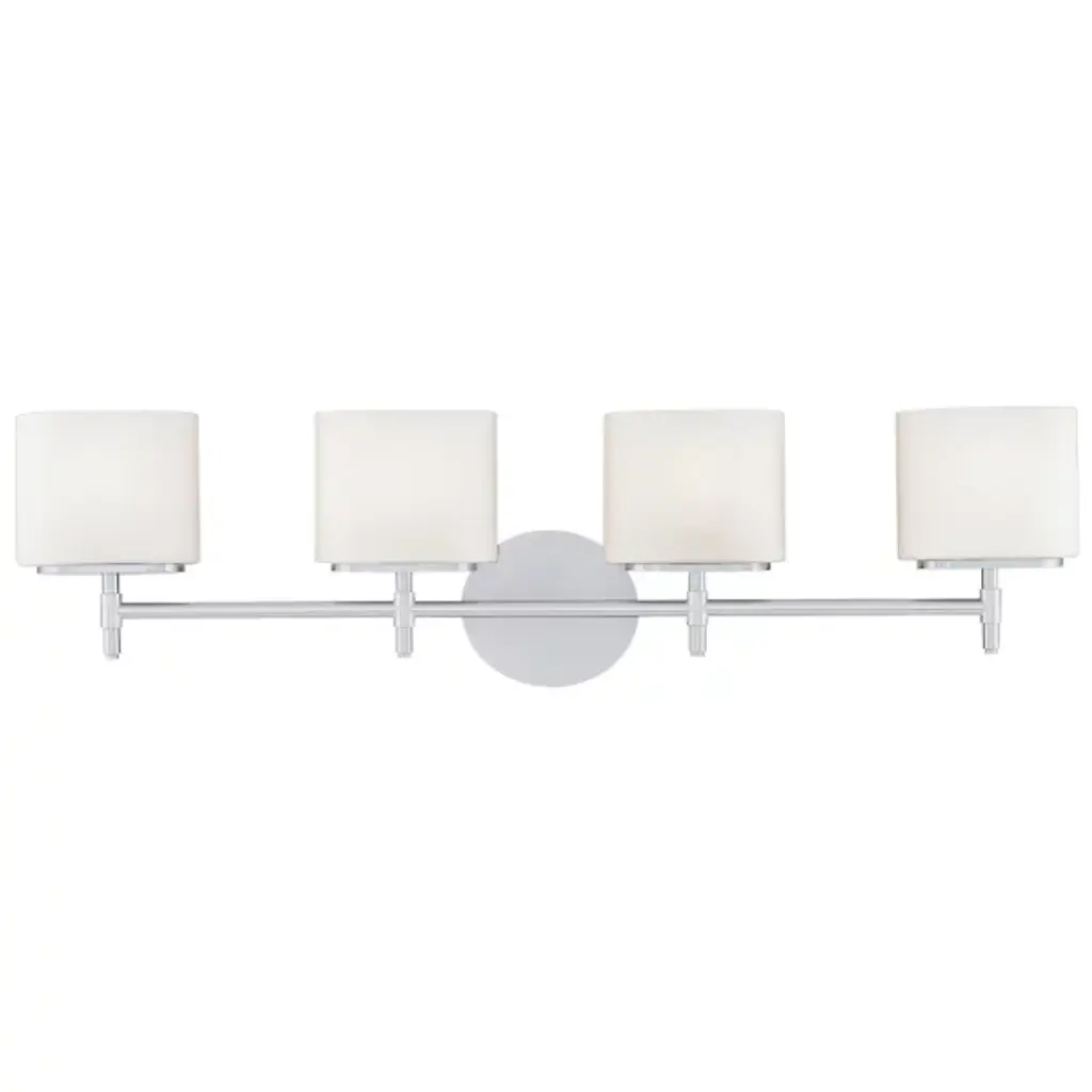 Clean, graceful lines of the arms + glass shades define the Willow family. Chrome fixtures and inner matte opal with clear outer glass shades create clean and unique designs. Bathroom/Powder Room Mounting Direction: Up/Down Shade Included: Yes Dimmable: Yes Material: Steel, Finish Color: Chrome, Width: 31.5", Height: 7.75", Length: 6", Depth: 6", Backplate Width: 4.5", Backplate Length: 8", Lamping Type: Incandescent, Number Of Bulbs: 4, Wattage: 100 Watts, Dimmable: Yes, Moisture Rating: Damp Rated