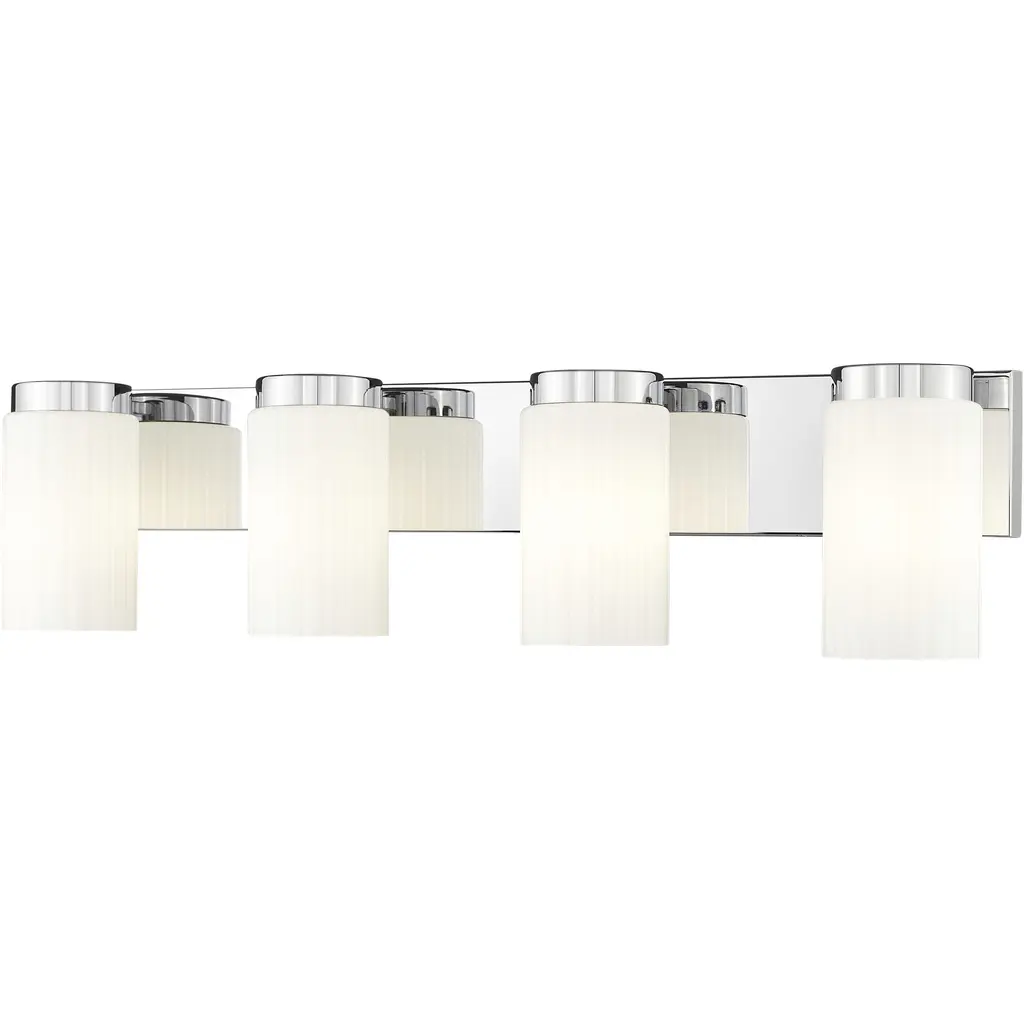Bent frosted glass shades are hung over chrome hardware on this five light vanity to create a modern touch for any room. Bathroom/Powder Room Shade Included: Yes Dimmable: Yes Material: Steel, Finish Color: Brushed Nickel, Width: 38.4", Height: 7", Length: 5", Depth: 5", Backplate Width: 4.5", Backplate Length: 38.5", Lamping Type: Incandescent, Number Of Bulbs: 5, Wattage: 60 Watts, Dimmable: Yes, Moisture Rating: Damp Rated