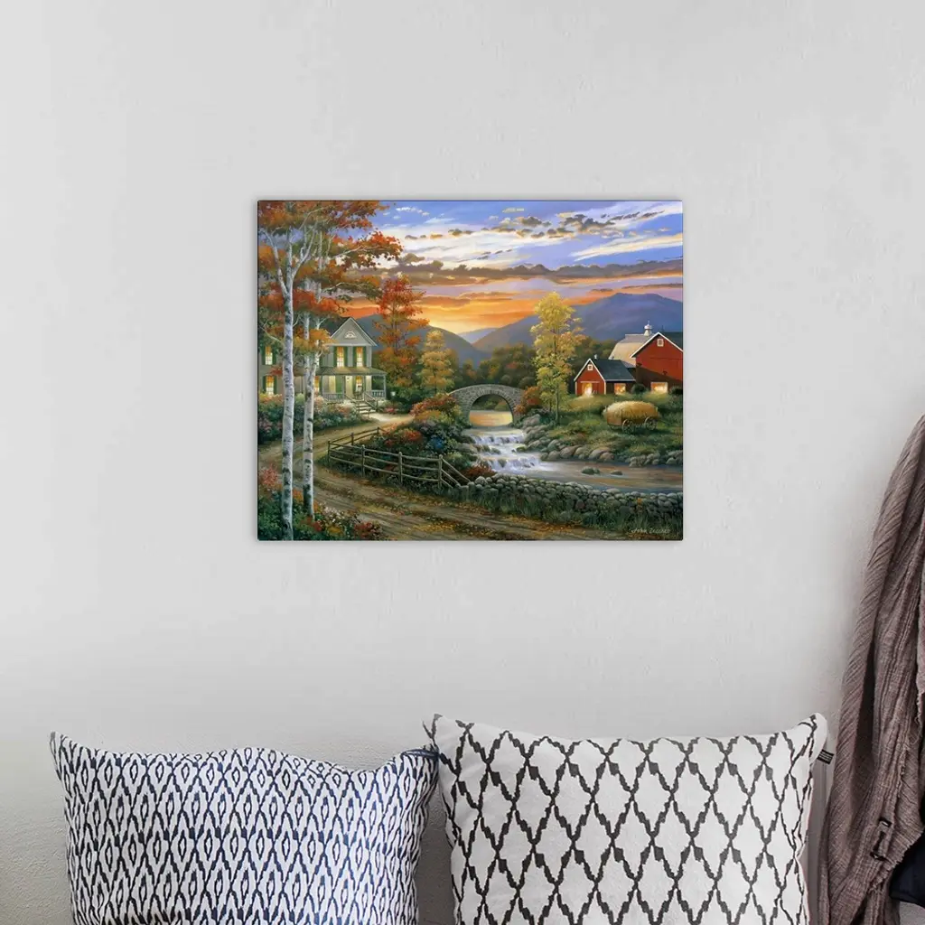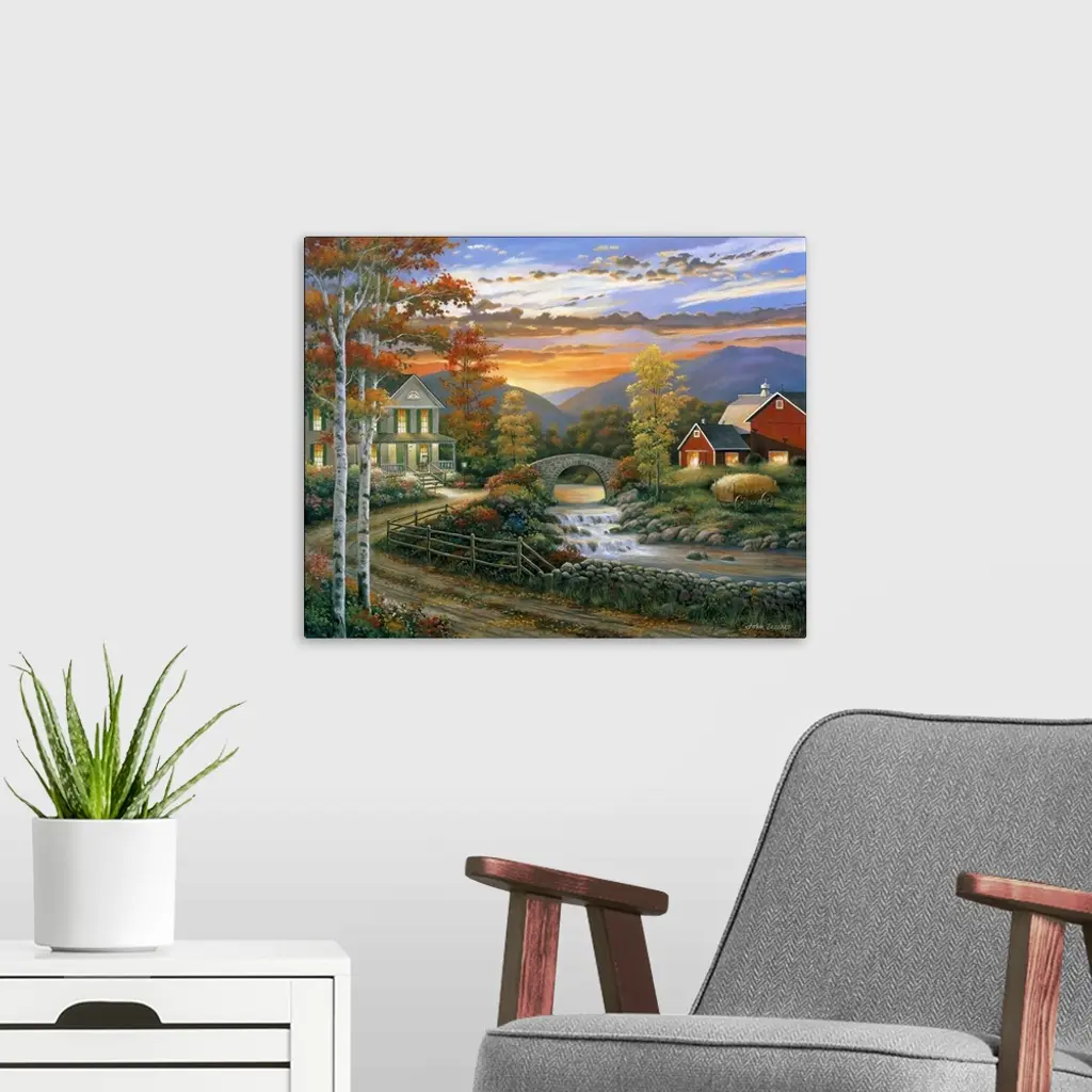 Farm and house by river during the fall.