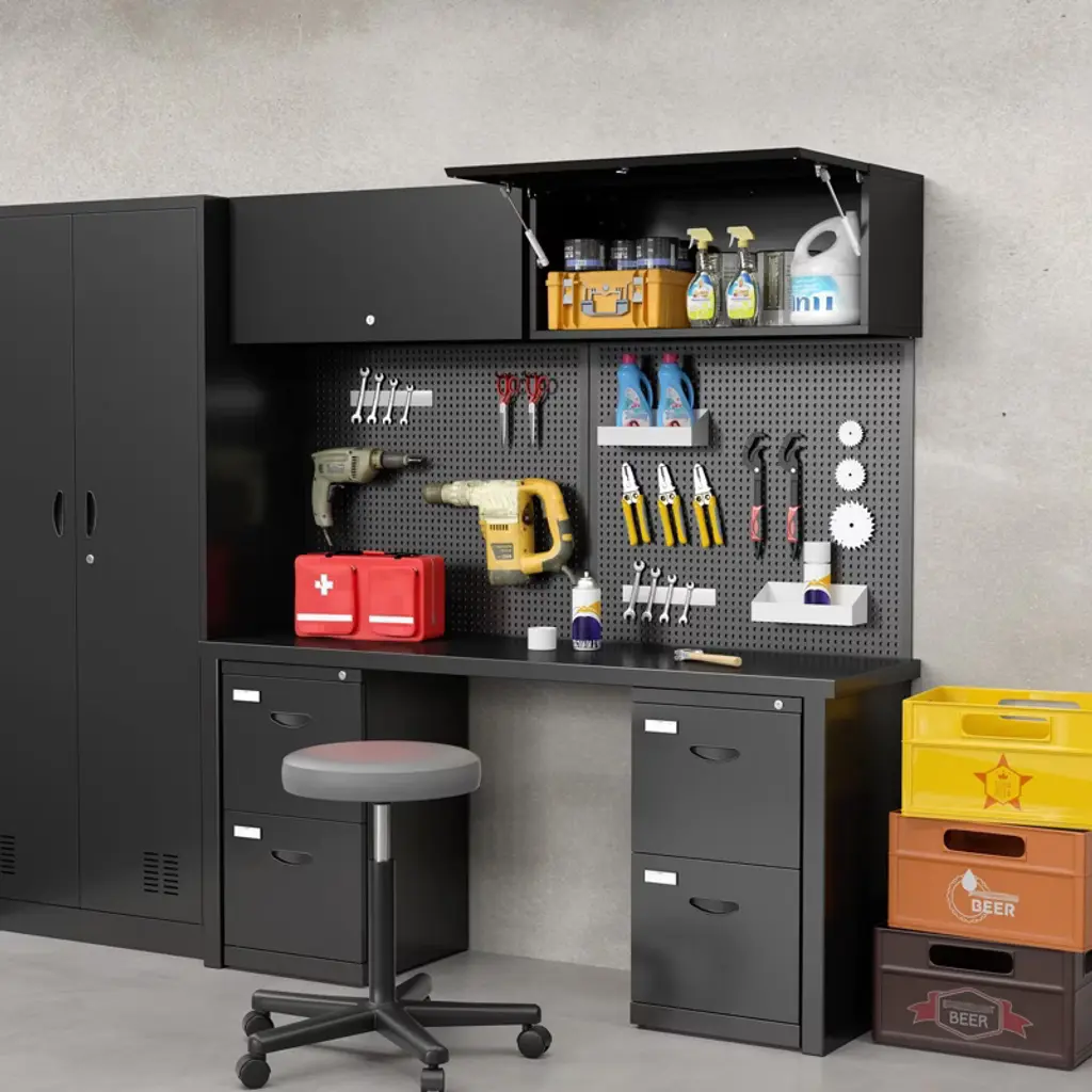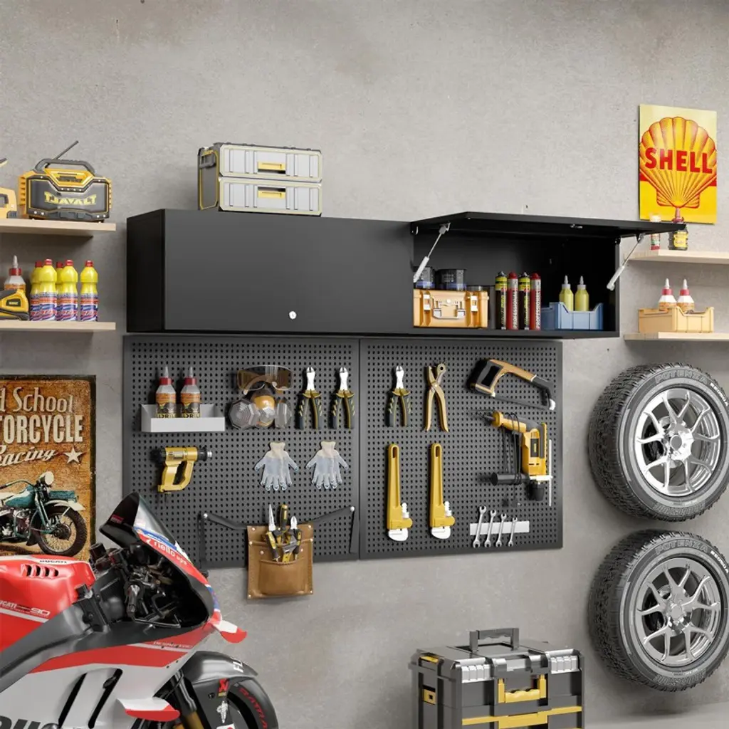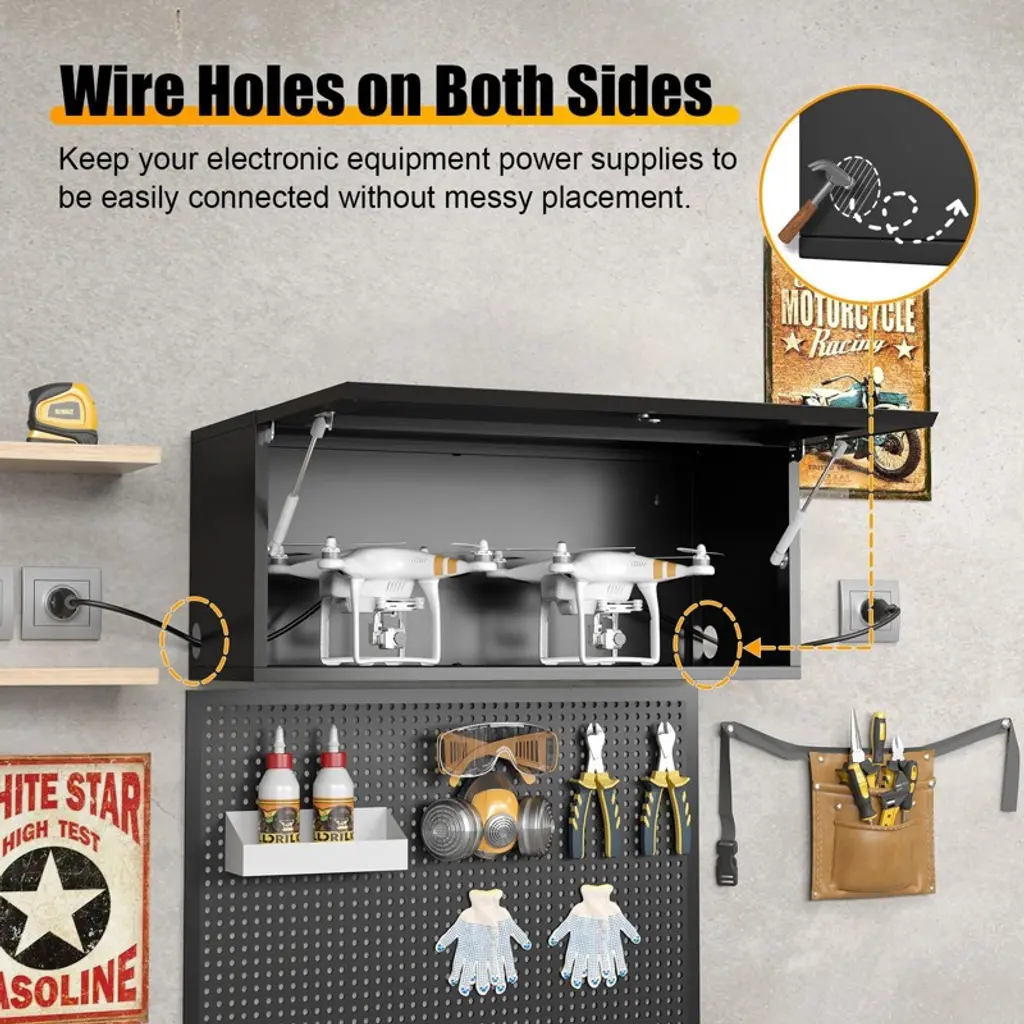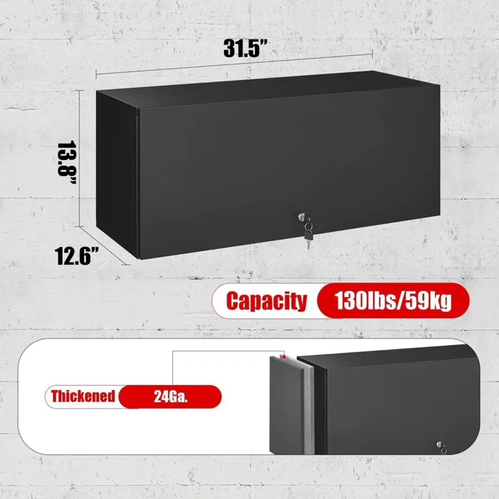 This 14 inch high metal garage wall cabinet features a hydraulic flip-up door, sturdy 0.6 mm steel construction, and a lock with 3 keys, offering 130 lbs shelf capacity for secure and space-saving storage.