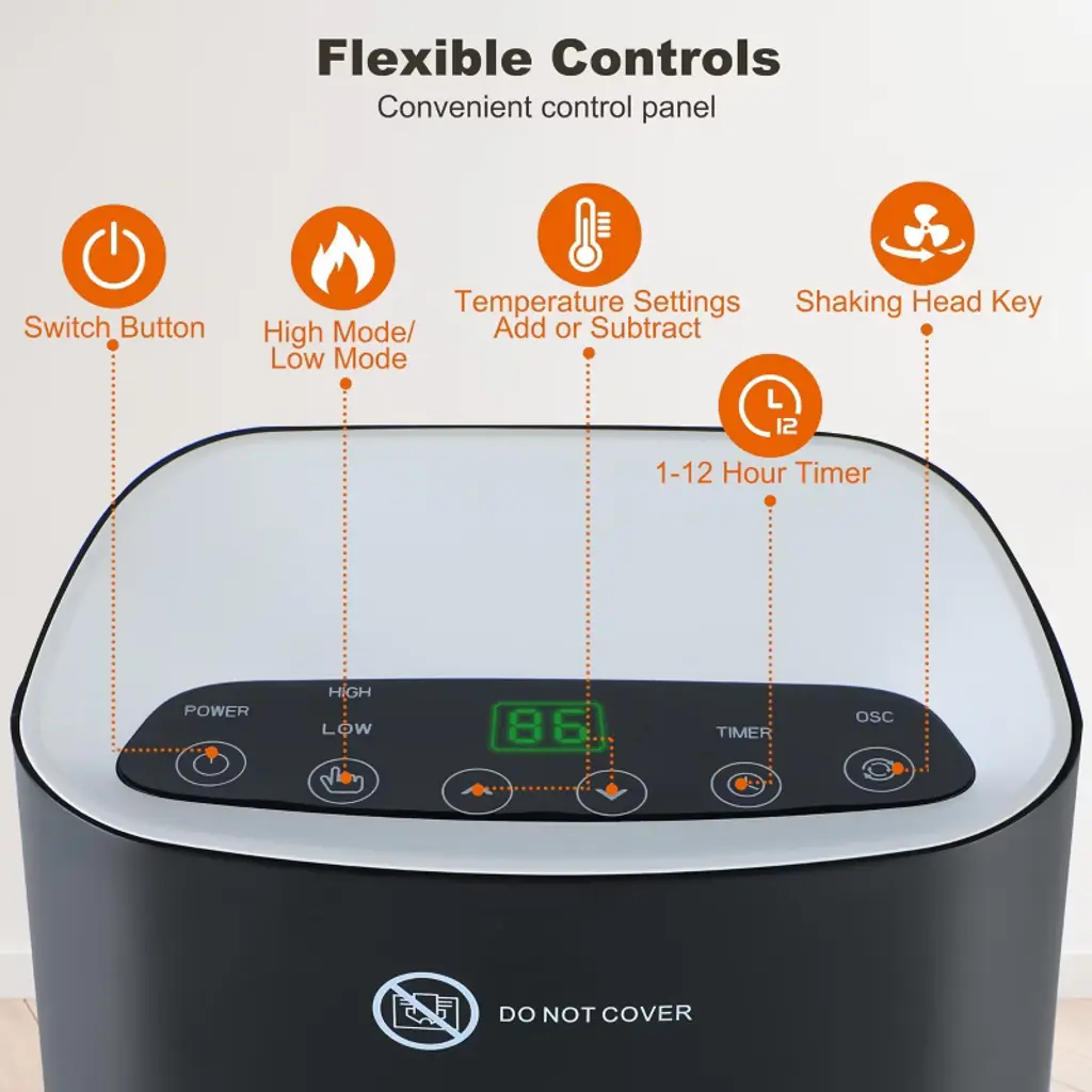 This electric space heater offers 2 heat modes and 80° oscillation for room-wide warmth. The digital display and remote control allow easy adjustments of temperature, timer, and oscillation. The 1-12 hour timer is programmable for convenience. Safety features include overheat and tip-over protection, shutting off at 149°F or if knocked over.