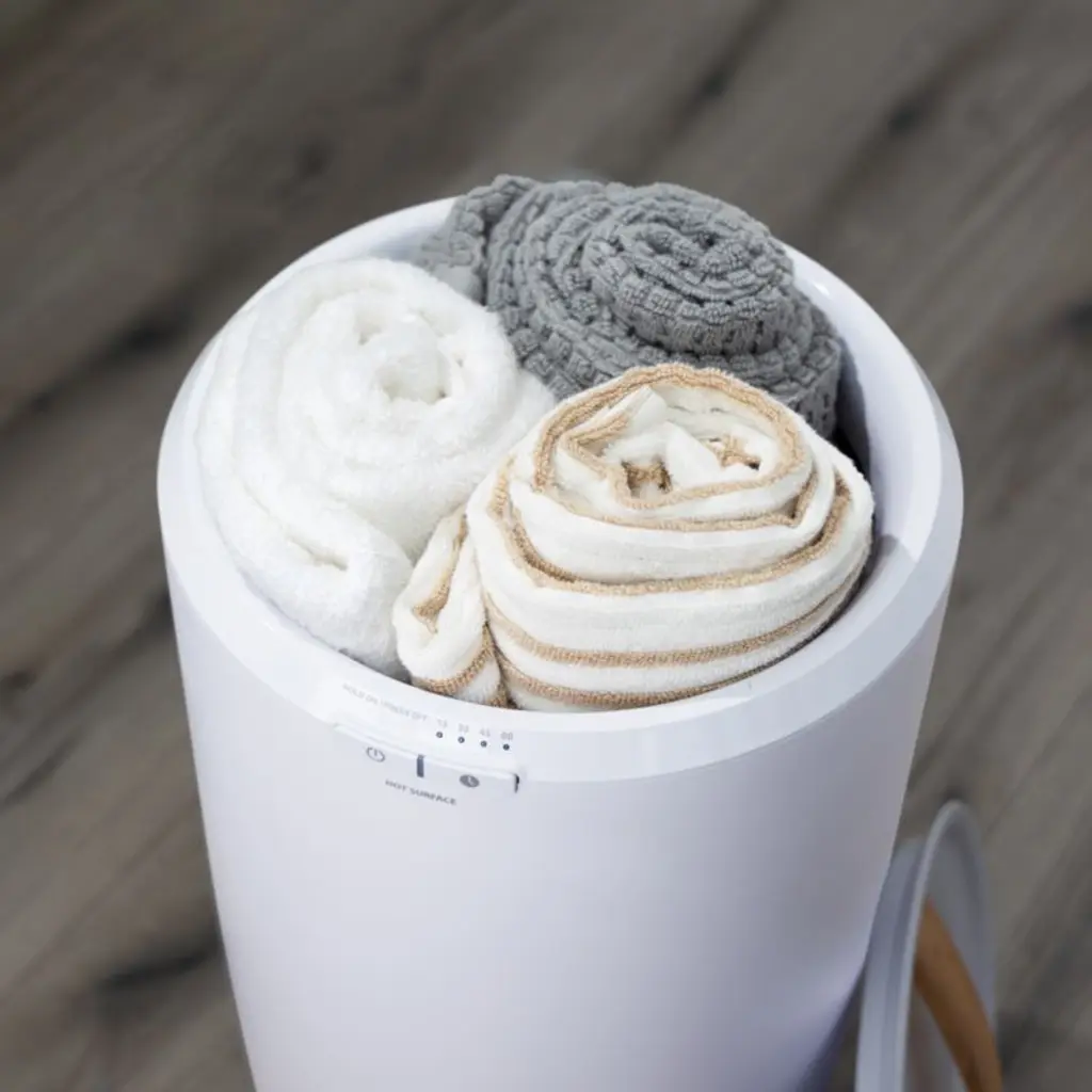 No longer a luxury reserved to spas, warmed towels are yours every day with this ingenious towel warmer. Choose from four timer settings up to 60 minutes to have your towel heated to the perfect temperature as you step out of the bath or shower. The towel warmer accommodates up to two 40"x70" bath towels, and you can also use it to warm up robes and throw blankets. Lightweight and freestanding, the bucket-style appliance has a small footprint and coordinates well with bath decor thanks to its neutral white exterior and warm wood accents.