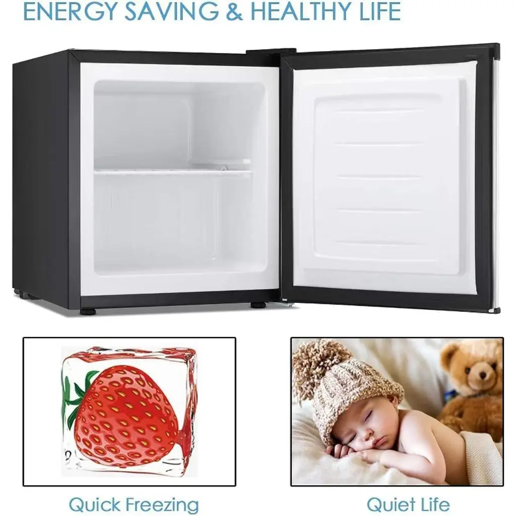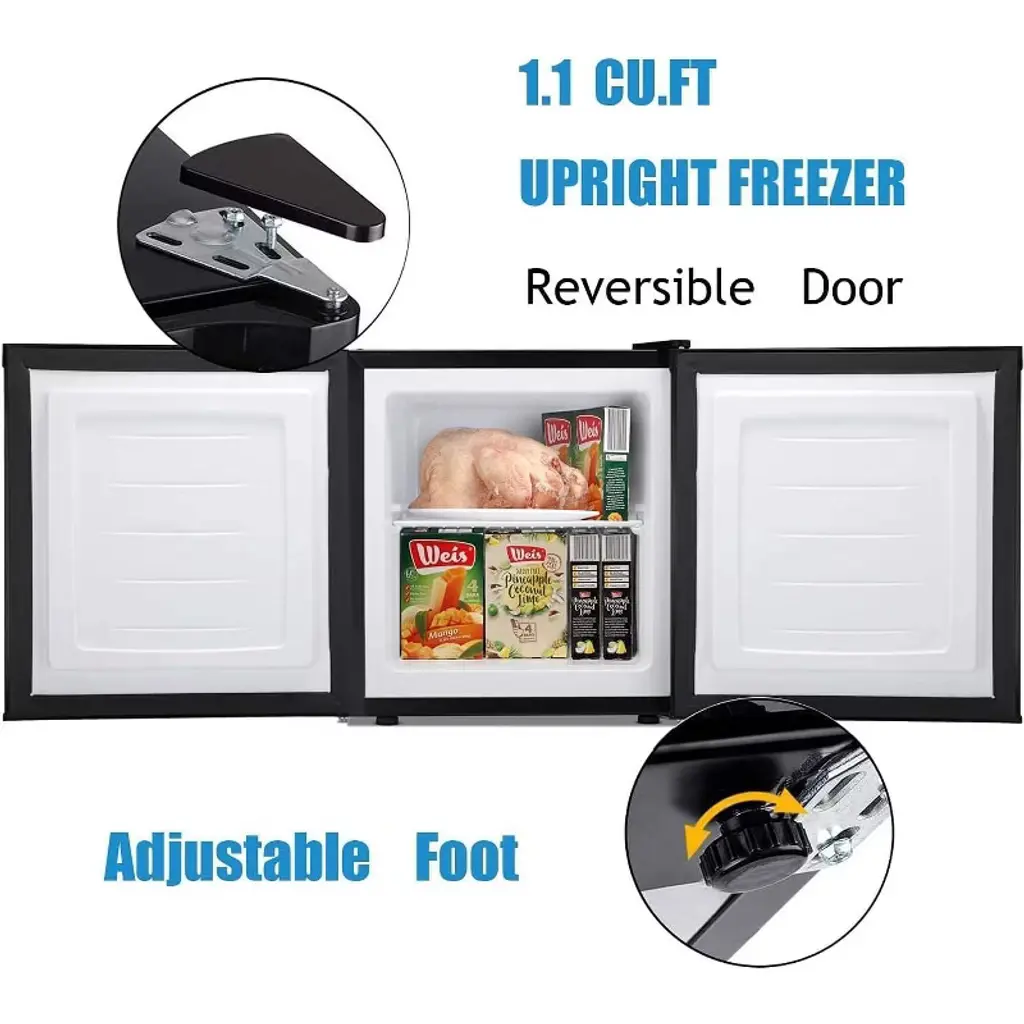 1.1 Cu.ft Upright Freezer. Spacious yet compact for tight spaces. 7 adjustable temp settings (-7.6°F to 6.8°F) for fast, quiet, efficient cooling. Reversible door, food-grade interior, and adjustable feet. Ideal for home, dorm, office.