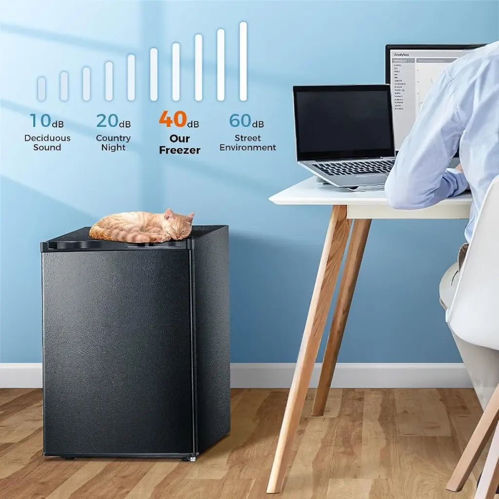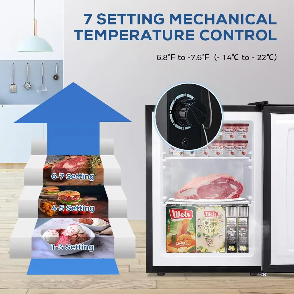 2.1 Cu.ft upright freezer, perfect for dorms, kitchens, or offices. It features rapid cooling that freezes thoroughly in just 10 minutes, seven adjustable temperature levels from -7.6°F to 6.8°F, and energy-efficient operation at only 0.6 kWh/day. With its space-saving design, reversible door, and quiet performance under 40dB, it's ideal for storing food, drinks and more.